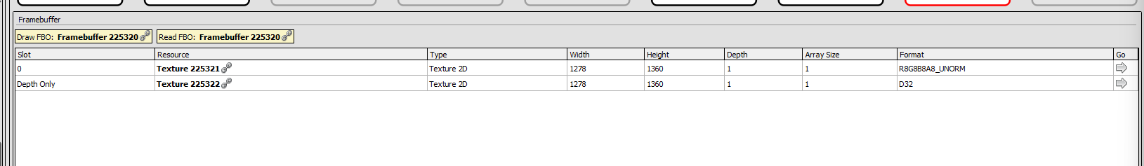 As seen on the image below, the framebuffer has two attachments, a color texture and a depth texture.