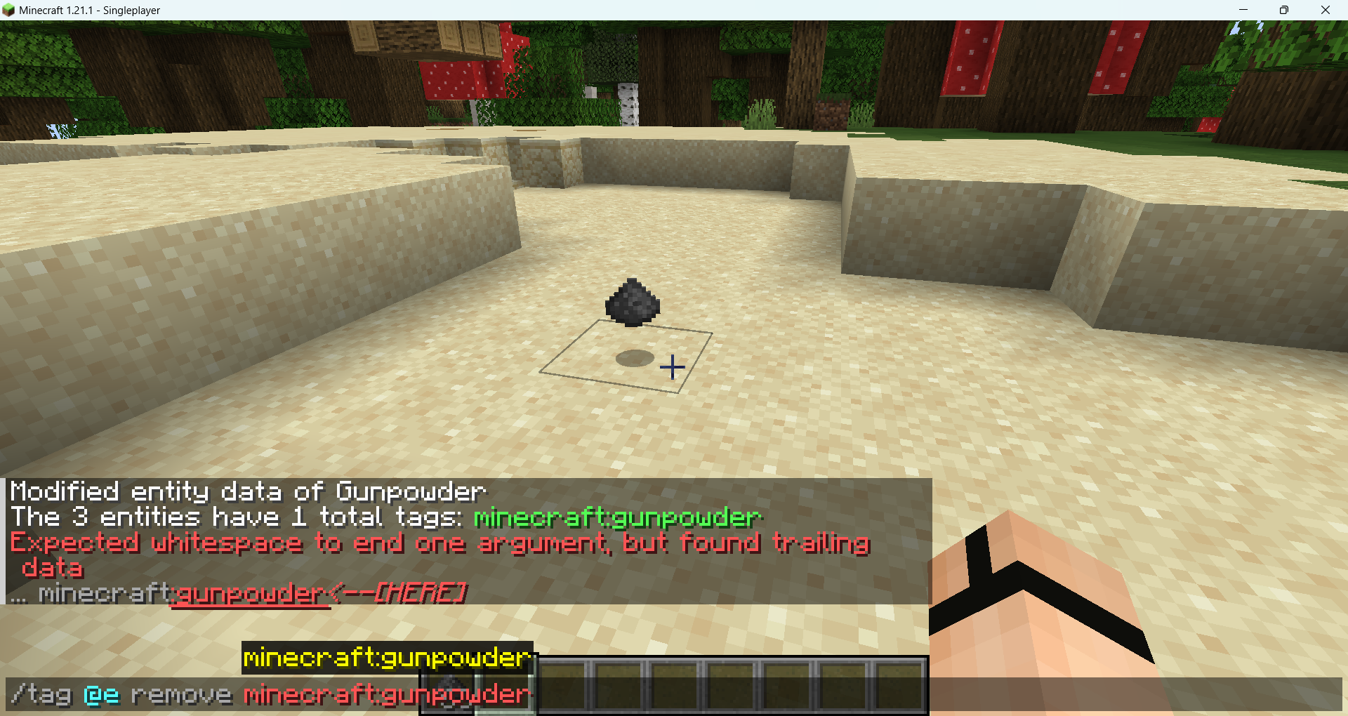 3. While near the same item, run the command "/tag @n[type=item] list". The server should return with the message "The [X] entities have 1 total tags: minecraft:gunpowder"