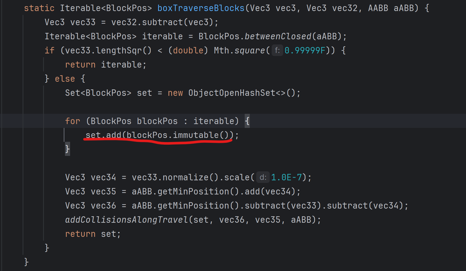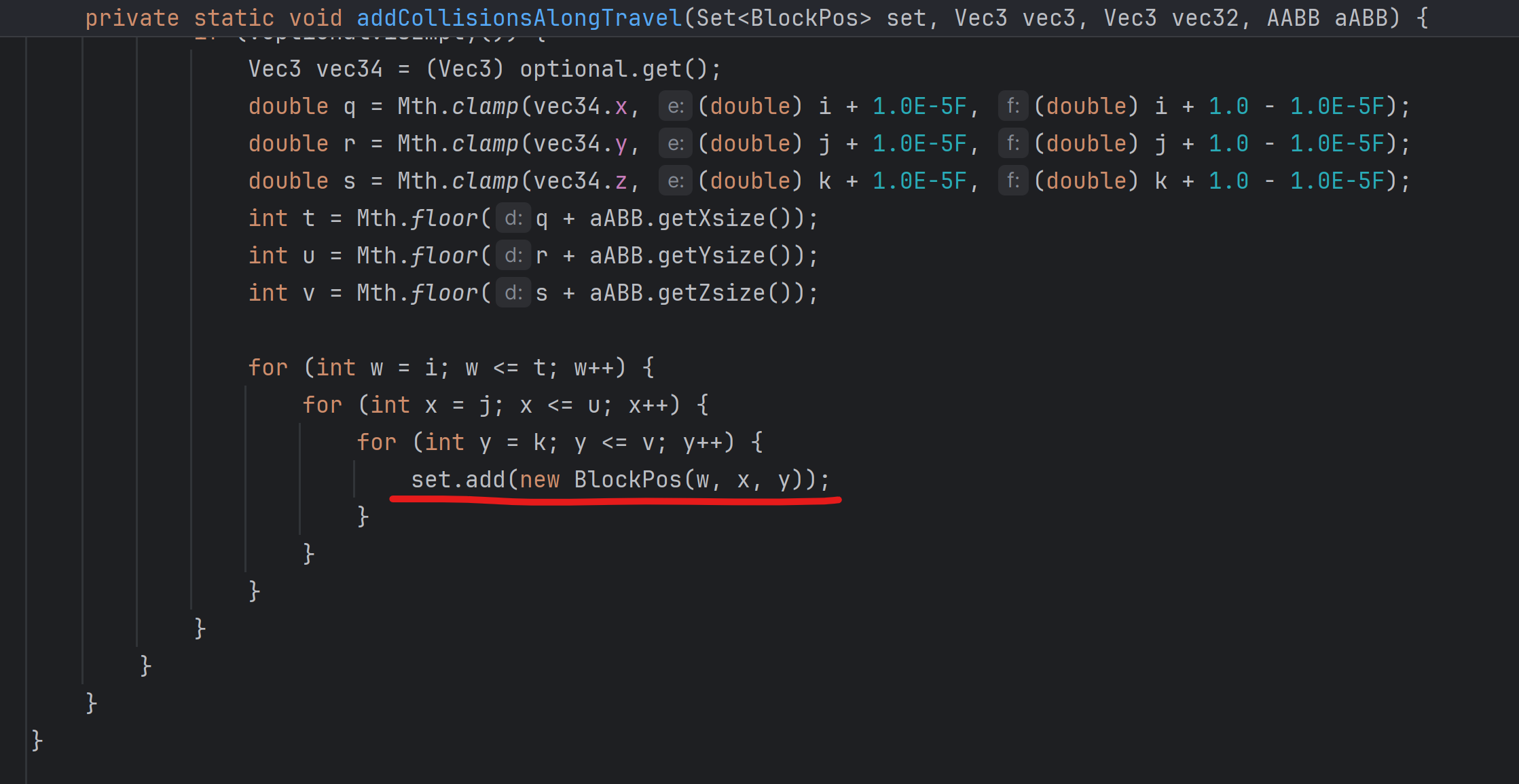 And by "executing collisions while the block coordinates are collected" i mean executing them inside inside the boxTraverseBlocks and addCollisionsAlongTravel immideately instead of puting the block coordinates into the set here:
