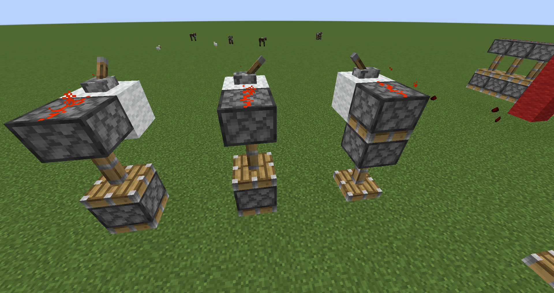 Two vertically stacked pistons pointing downward, connected by Redstone on top, behave differently depending on certain coordinates/diagonals. Most of the time, the upper piston extends and pushes the lower piston down. However, at certain coordinates, only the lower piston extends instead.