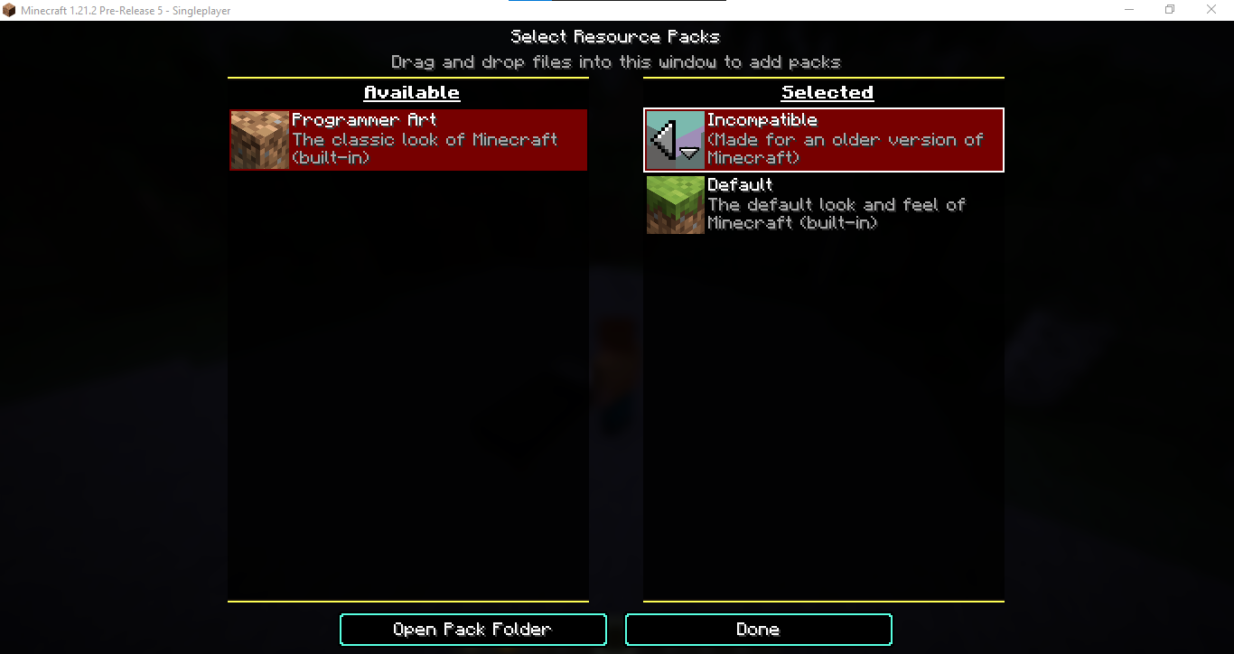 If you go to Options → Resource Packs, you will see that the High Contrast and Programmer Arts Resource Packs are listed as Made for an older version of Minecraft.