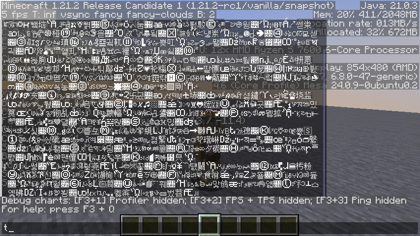 "Obfuscated" text will cause the affected letters to switch to another random character every tick. This has the very undesirable side effect of cluttering the internal font atlases, which causes the game to take up a lot more memory than it needs to.