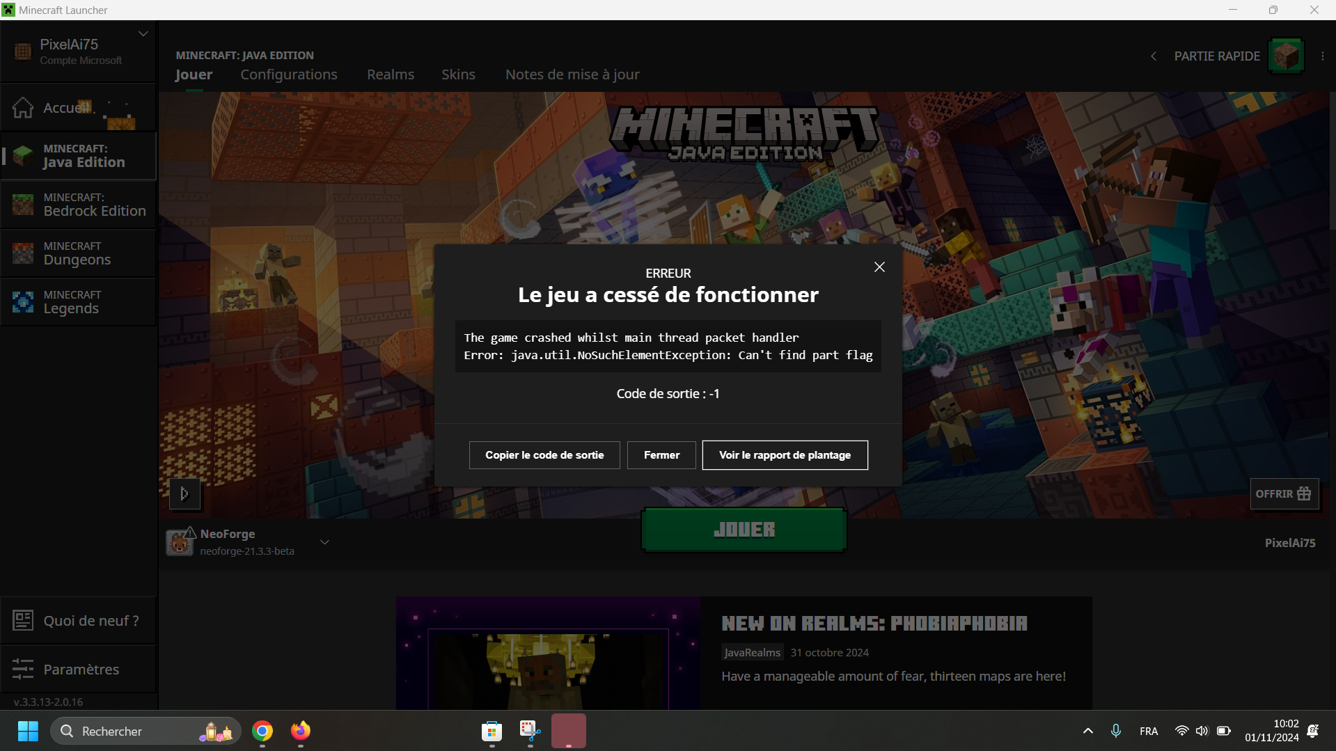 Le jeu plante et se ferm." (Rapport de Plantage : ---- Minecraft Crash Report ----