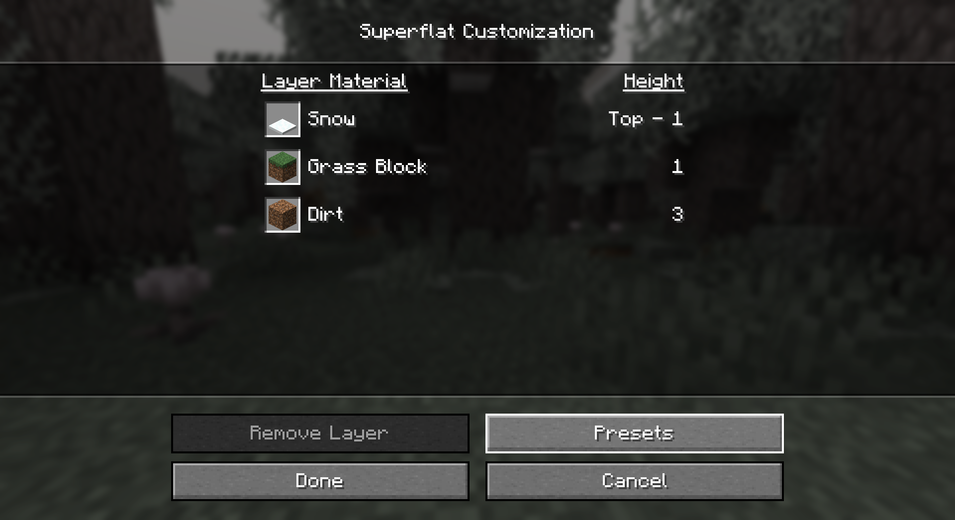Selecting or entering a preset in the superflat customization menu using a different amount of layers than the previous preset causes issues depending on whether it has more or less layers. If it has more layers, it will only show as many layers as the menu was already showing on the previous preset. If it has less layers, the game will immediately crash (potentially trying to show the same amount of layers, but crashing when there isn't another layer to show?).