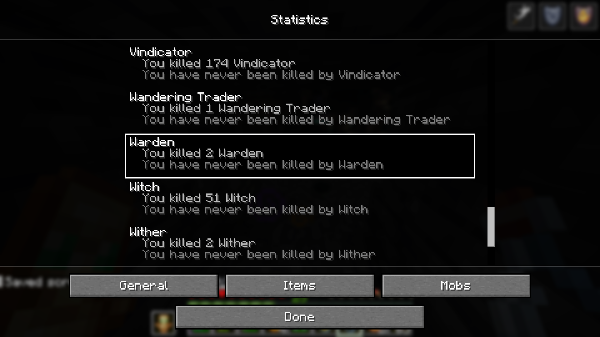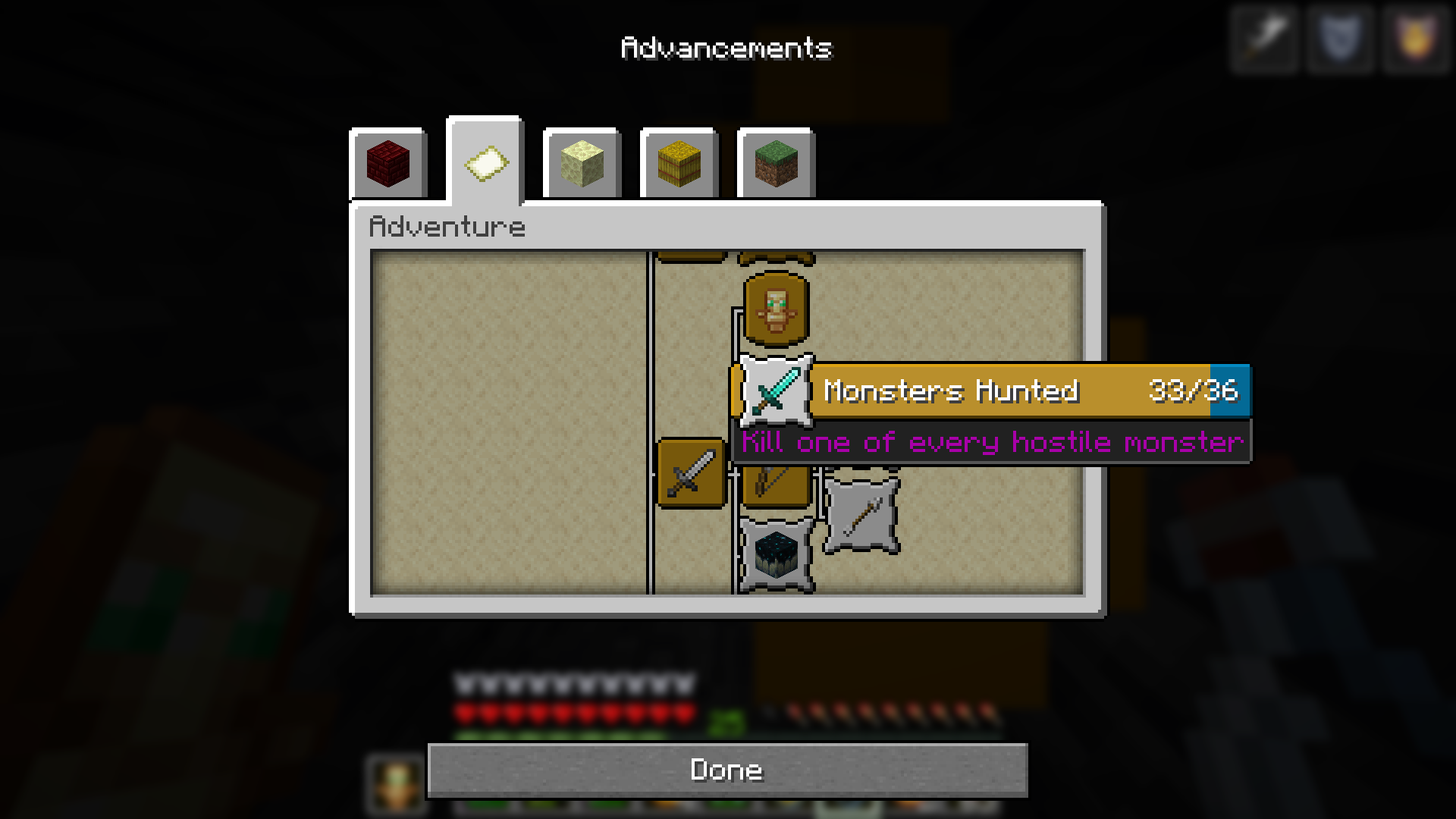 Hello mojang, today I was playing on my survival world and thought that I should defeat the warden. so, i prepared myself a bit and then also found an ancient city. before all this my advancement tab showed that i have defeated 33/36 hostile mobs in the "monsters hunted" advancement. i defeated the warden pretty easily, thanks to my armor. after all this i checked that if the advancement is chanced from 33/36 to 34/36 but, it was still on 33/36. i checked my statics which did say that i have defeated a warden in my survival world. i tried defeating another warden but that still did not change anything. i thought that this is only happening in my survival world and tried killing the warden by generating another world but it was the same case for that world also. so can i get this bug fixed mojang pls?