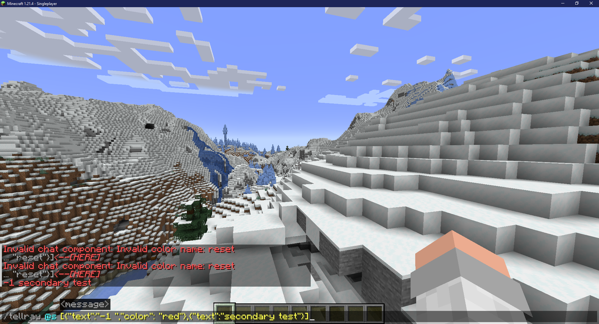 /tellraw @s [{"text":"-1 ","color": "red"},{"text":"secondary test","color": "reset"}]
