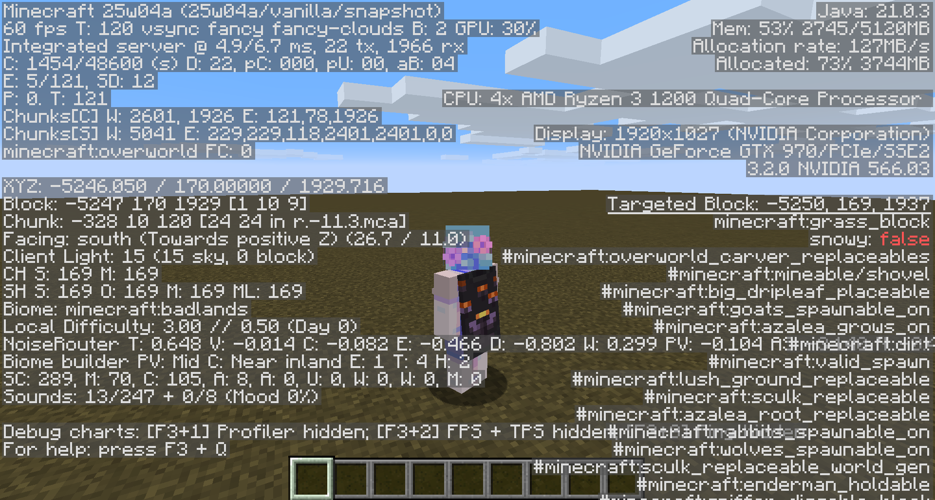 After killing all entities, creating a huge plane of grass in a Badlands biome, upping the tick speed and letting it sit like this for a few hours, absolutely no farm animals spawned. So surely, this meant farm animals couldn't spawn in badlands at all despite the changelog's mention of it, even in grass?