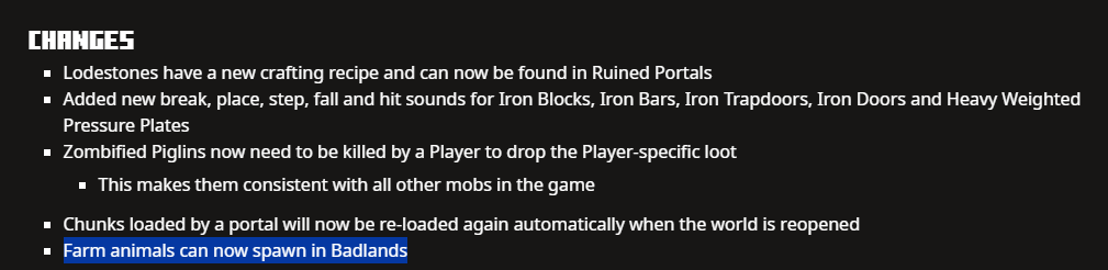 I'm unsure what the intentions of mob spawning in Badlands is. The changelog made it seem like they'd be spawning in average run of the mill Badlands biomes, but aside from in a superflat world, they don't seem to at all, even in the presence of grass. They DO spawn in Wooded Badlands, but it seems to be quite rare and not happen in an average Badlands, only in the very very large ones with lots of Wooded Badlands present.