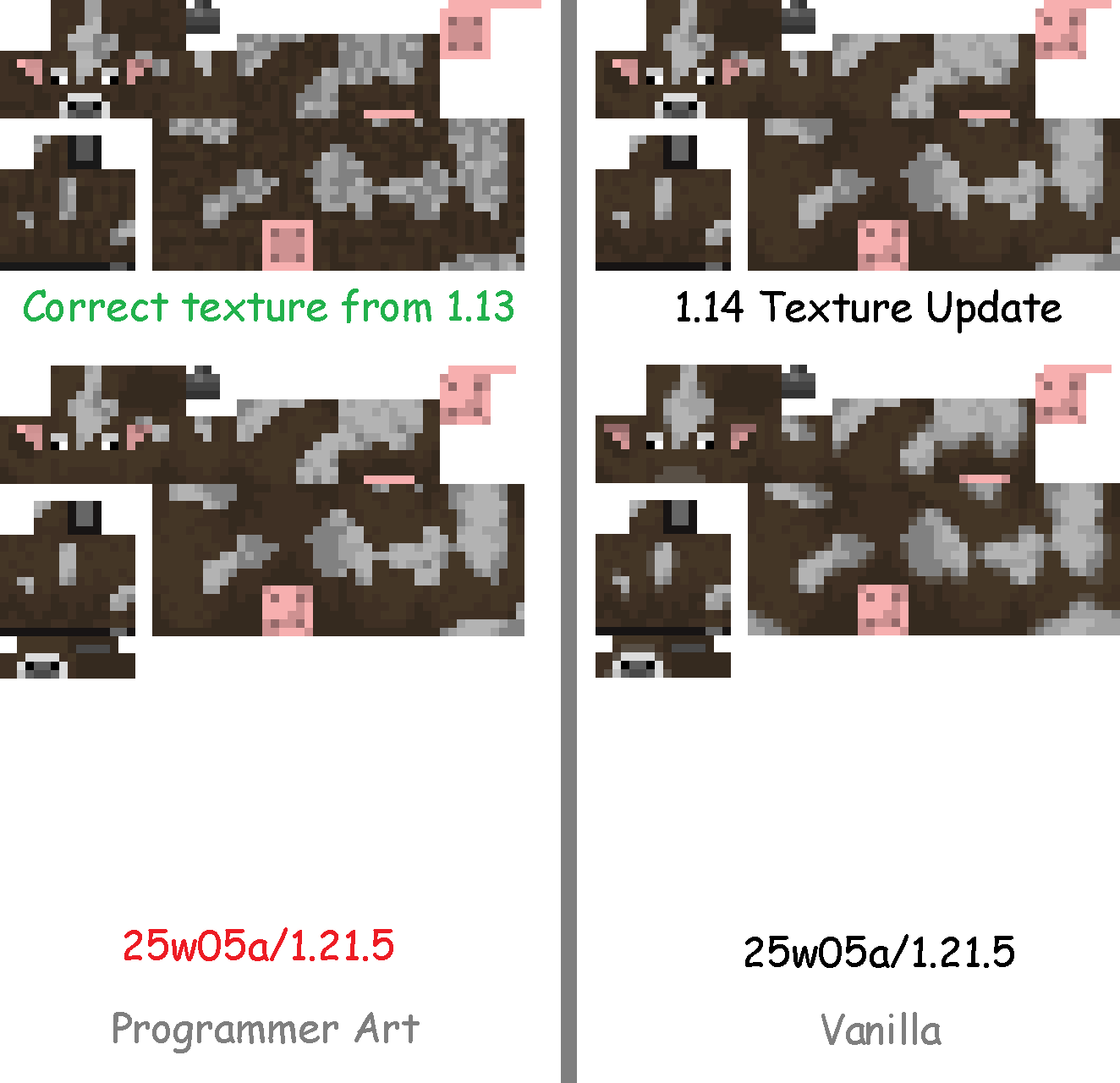With the Programmer Art resource pack enabled, temperate cows use the 1.14 Jappa texture instead of the expected classic texture from 1.13