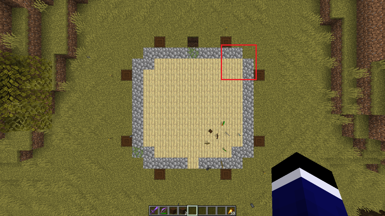 /fill ~-7 ~ ~-7 ~7 ~19 ~7 airto reveal the floorObserve that the northwest corner is different than other corners.