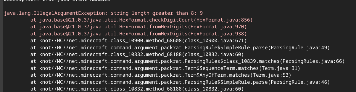 Steps to Reproduce: Type `/tellraw @s {text:"\U000000A7b"}` Upon typing b, it will crash