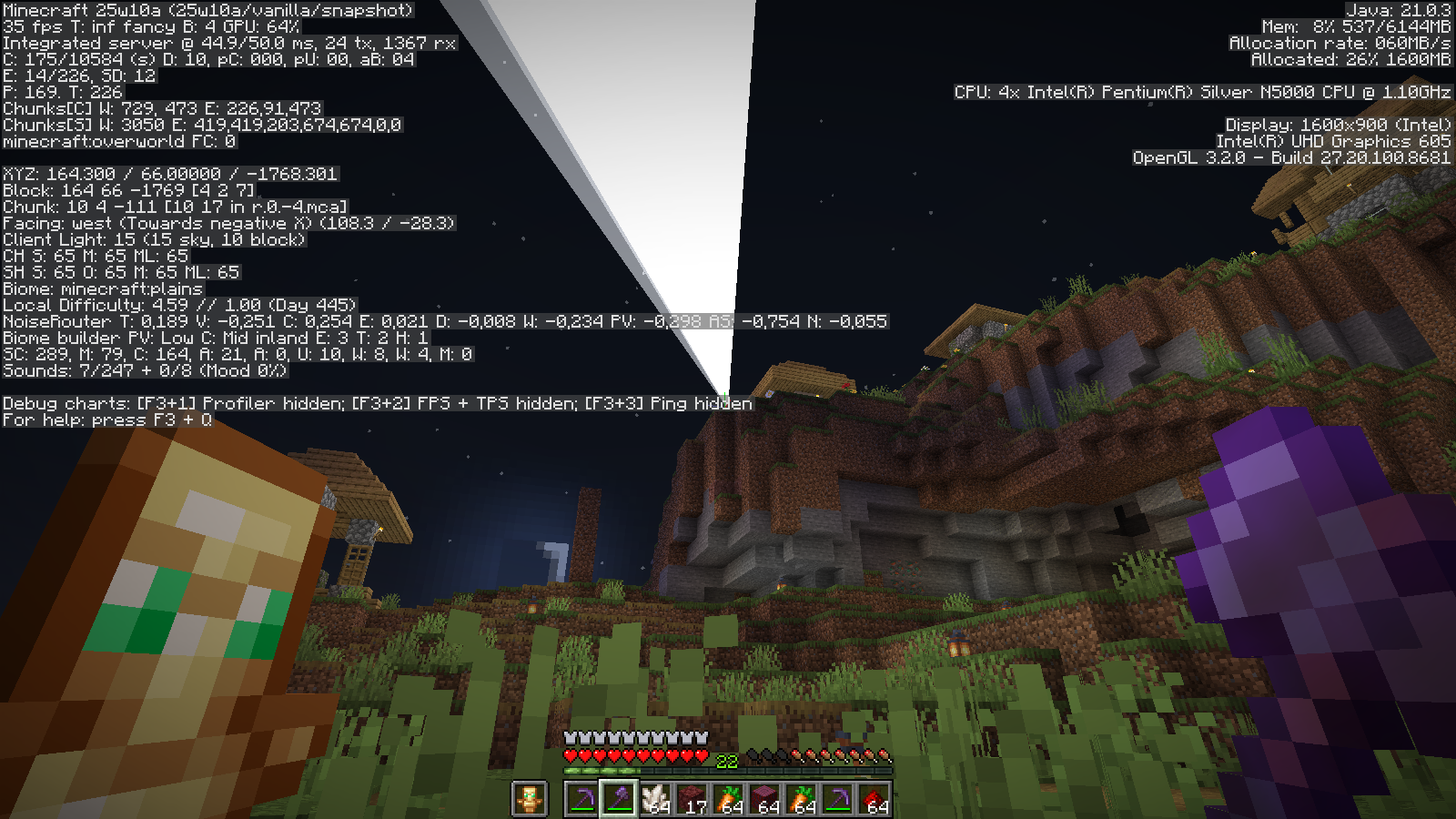 In the snapshot, 25w10a entered his world, a graphic artifact in the form of a white triangle is displayed near the cursor to the edges of the screen, and when running over the character, a graffiti white artifact is visible (which looks like a large stretched texture from the foot)