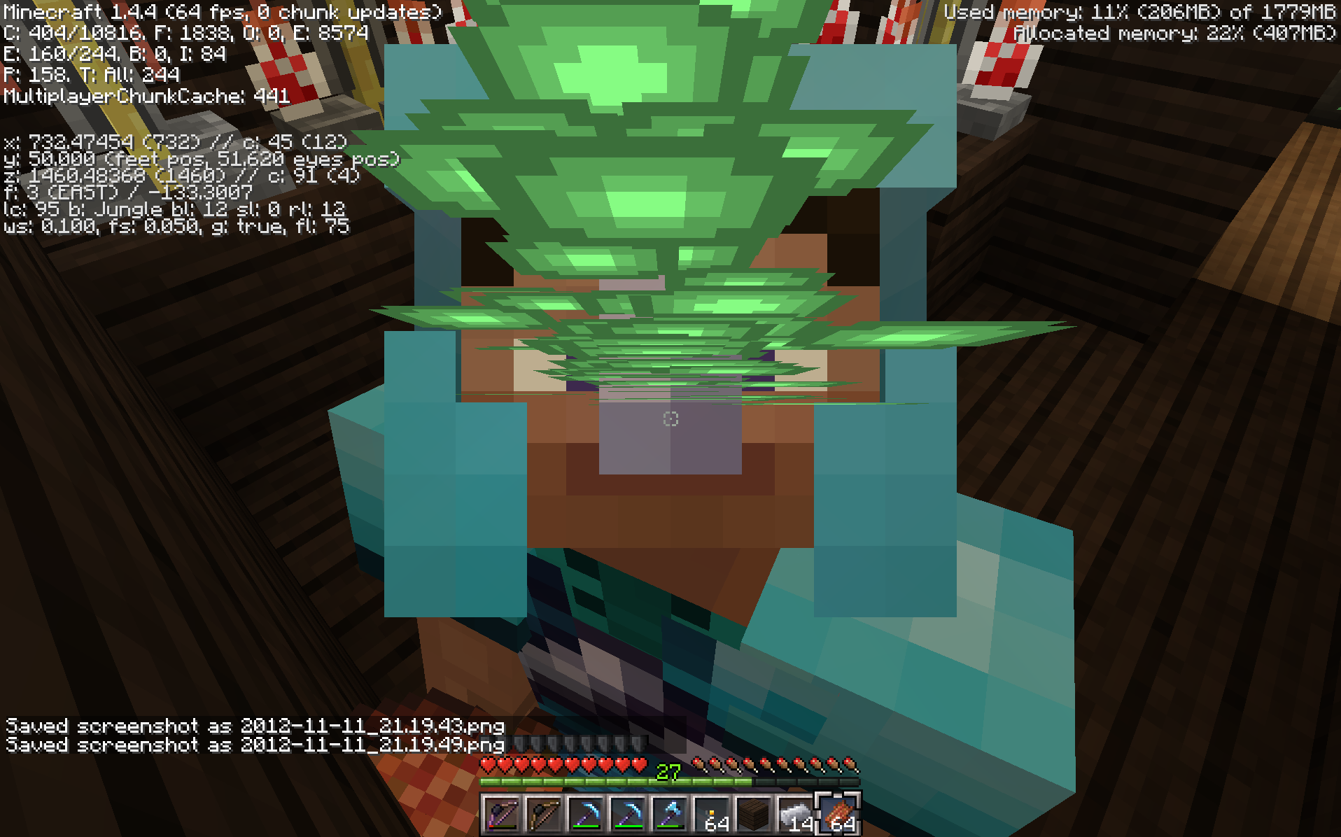 When a lot of XP orbs are orbiting around my avatar, their are displayed differently in the two third-person views. In the "rear" view, the orb always looks round, regardless of the view angle. The the "front" view however, the orbs look like as if they were displayed on a vertical plane and they will disappear if the avatar is looked from top or bottom (the attached picture show them from 45 deg).