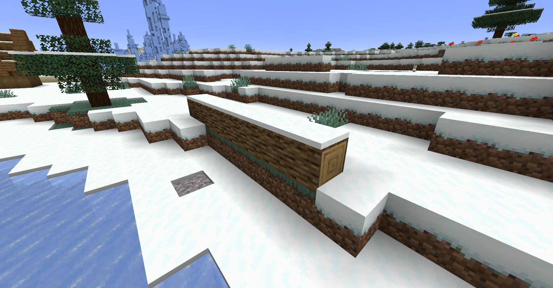 Third screenshot: The structure naturally spawning in the Snowy Plains (its layers have been removed by the snow feature).