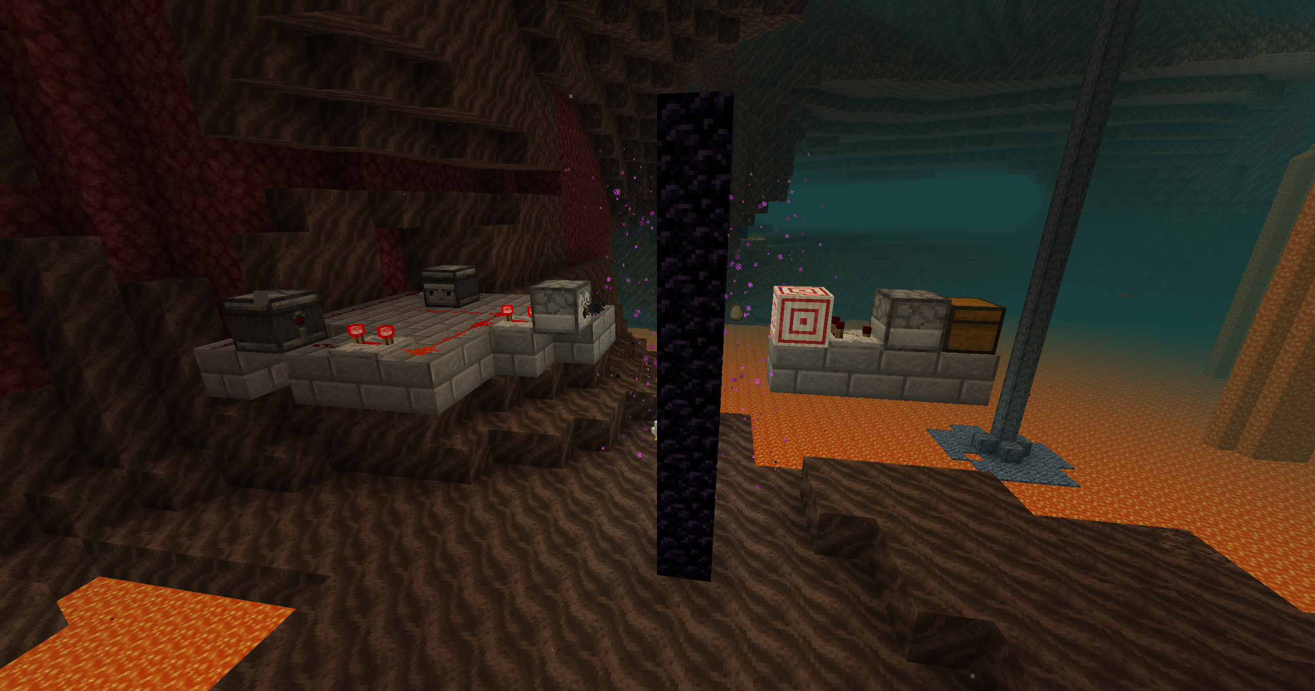 A target triggering a full dropper into an empty chest to count hits is placed behind the Portal in both dimensions.