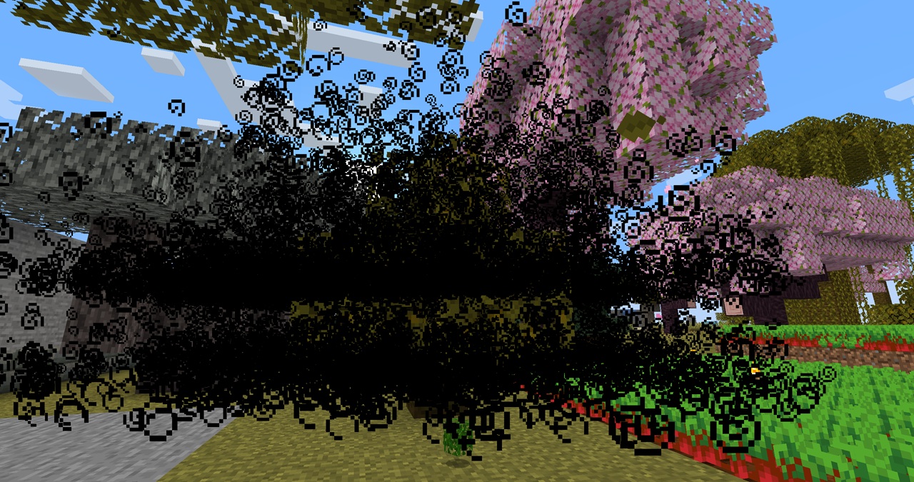 When breaking leaves, large black potion effect cloud appears and slowly dissipates. Only occurs on two of my survival worlds - doesn’t occur in either of my creative worlds or a recent survival world. Doesn’t occur on a brand new world. No mods or resource packs currently installed.