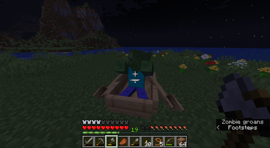 /summon minecraft:oak_boat ~ ~ ~ {Passengers:[{id:"minecraft:zombie",equipment:{head:{id:"minecraft:leather_helmet",Unbreakable:1b}}}]}Go into survival