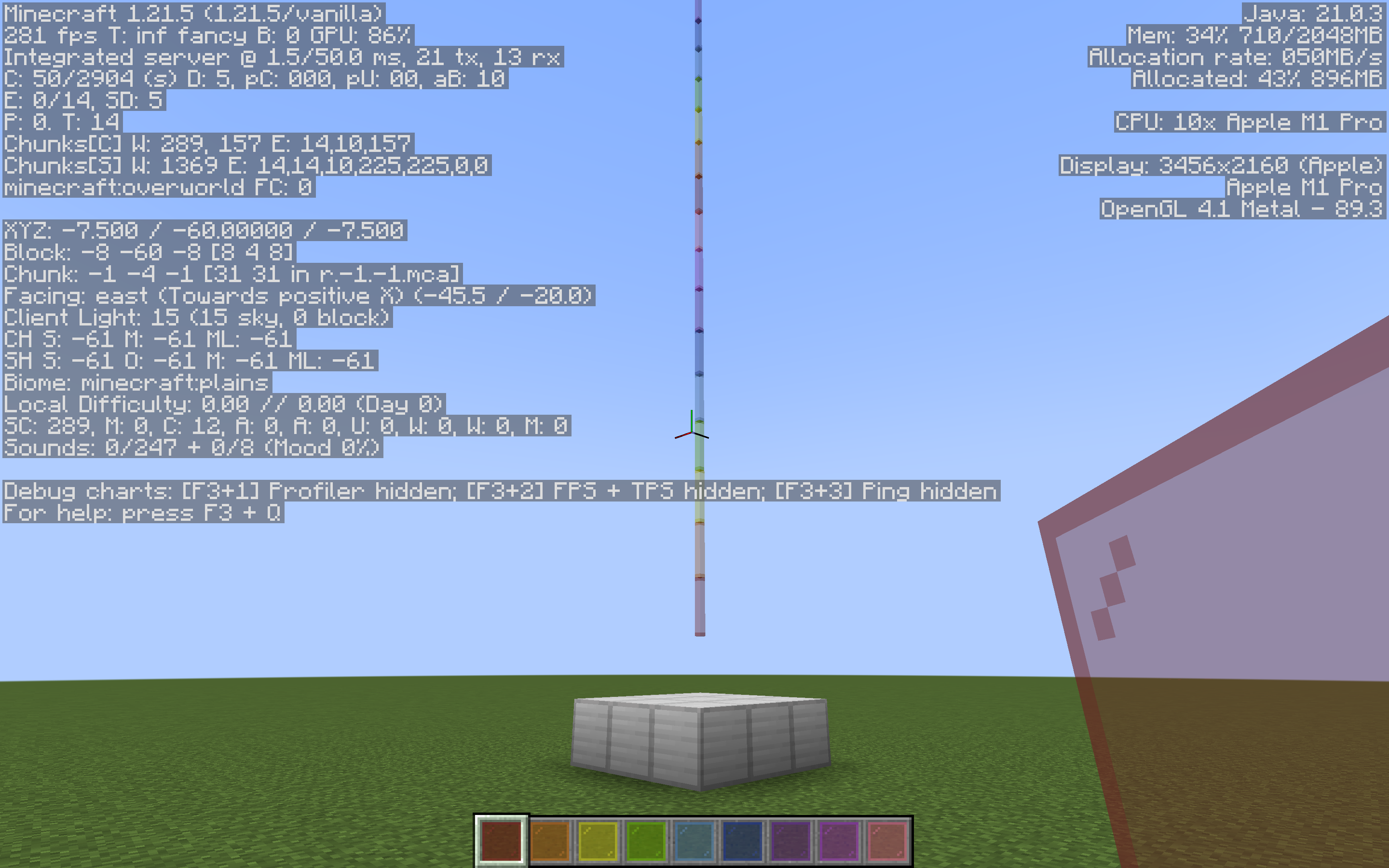 Test: a rainbow beacon in a default superflat world. The Beacon with stained glass panes above from y=-60 to y=320, with repeating pattern: red, orange, yellow, lime, light blue, blue, purple, magenta, pink.