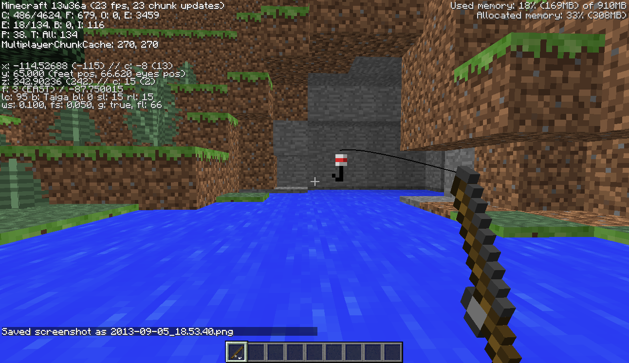 I tried fishing in both the flying and the standing mode, in both survival, and creative(using commands),and found that the bobber floats above the water and acts as if i was fishing on a solid block(any other block other than water) i tried this in both small pond-like areas, along with the new "deep ocean" biome, and still had the same problem