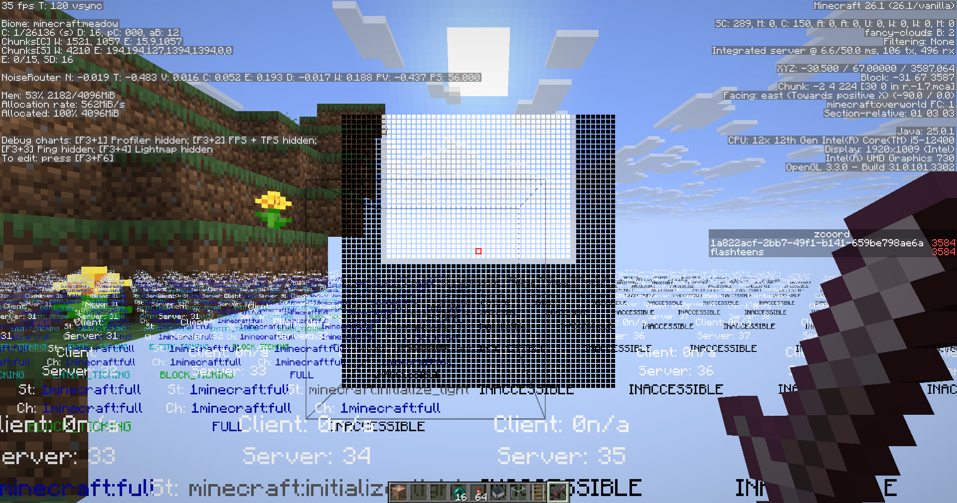 5. To better demonstrate whether or not the chunks are loaded, here’s a screenshot for the visualize_chunks_on_server status (enabled by opening the F3+F6 settings). When the bug happens, the chunk loading status is like below: