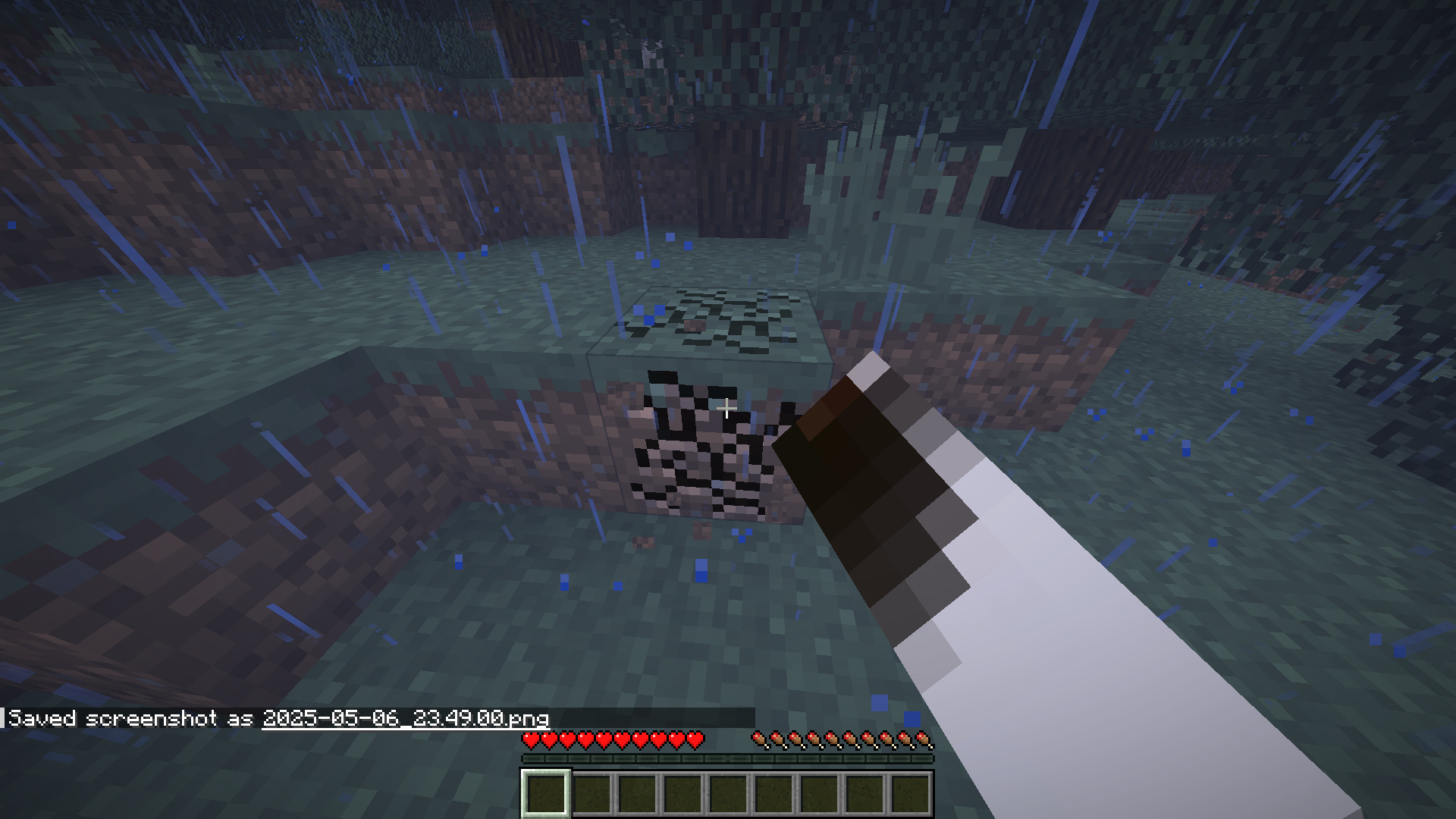When breaking a block, the overlay that shows the progress doesn’t seem to be affected by the desaturation of the environmental fog. This was tested while it was raining, when the fog is the heaviest. It looks out of place compared to the rest of the blocks and particles surrounding the area. This was tested with no resource pack and the programmer art pack.