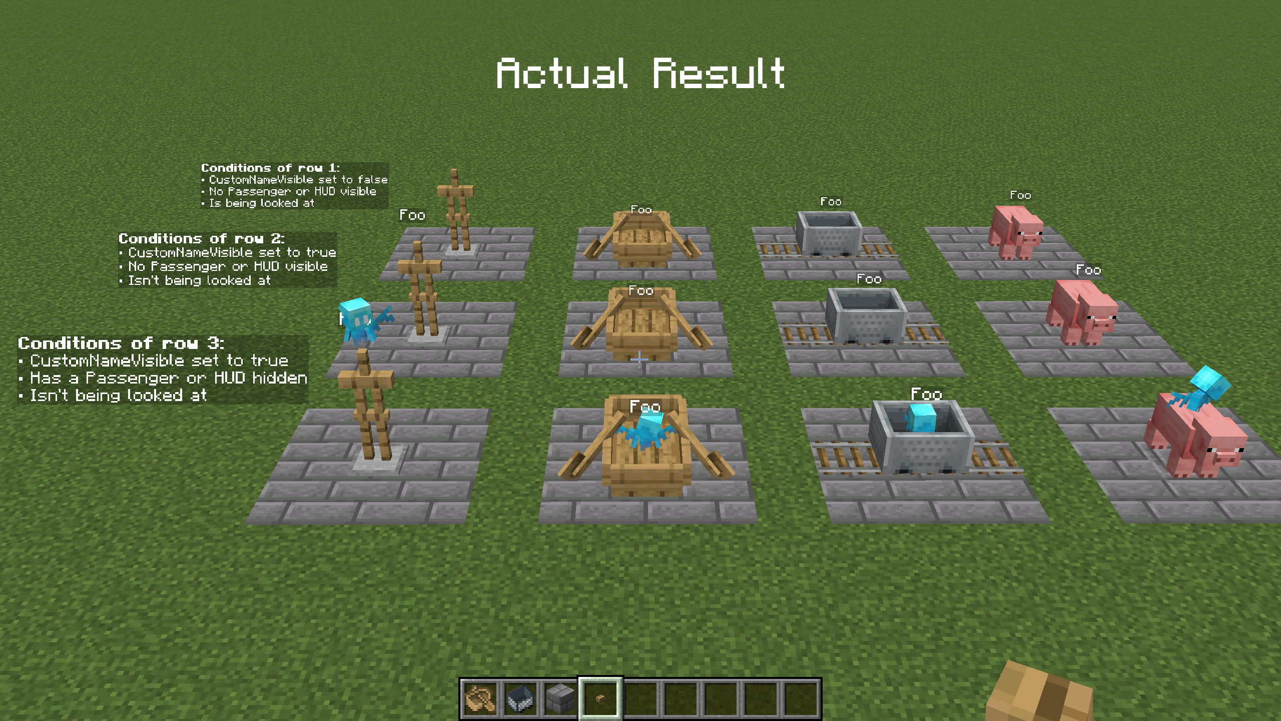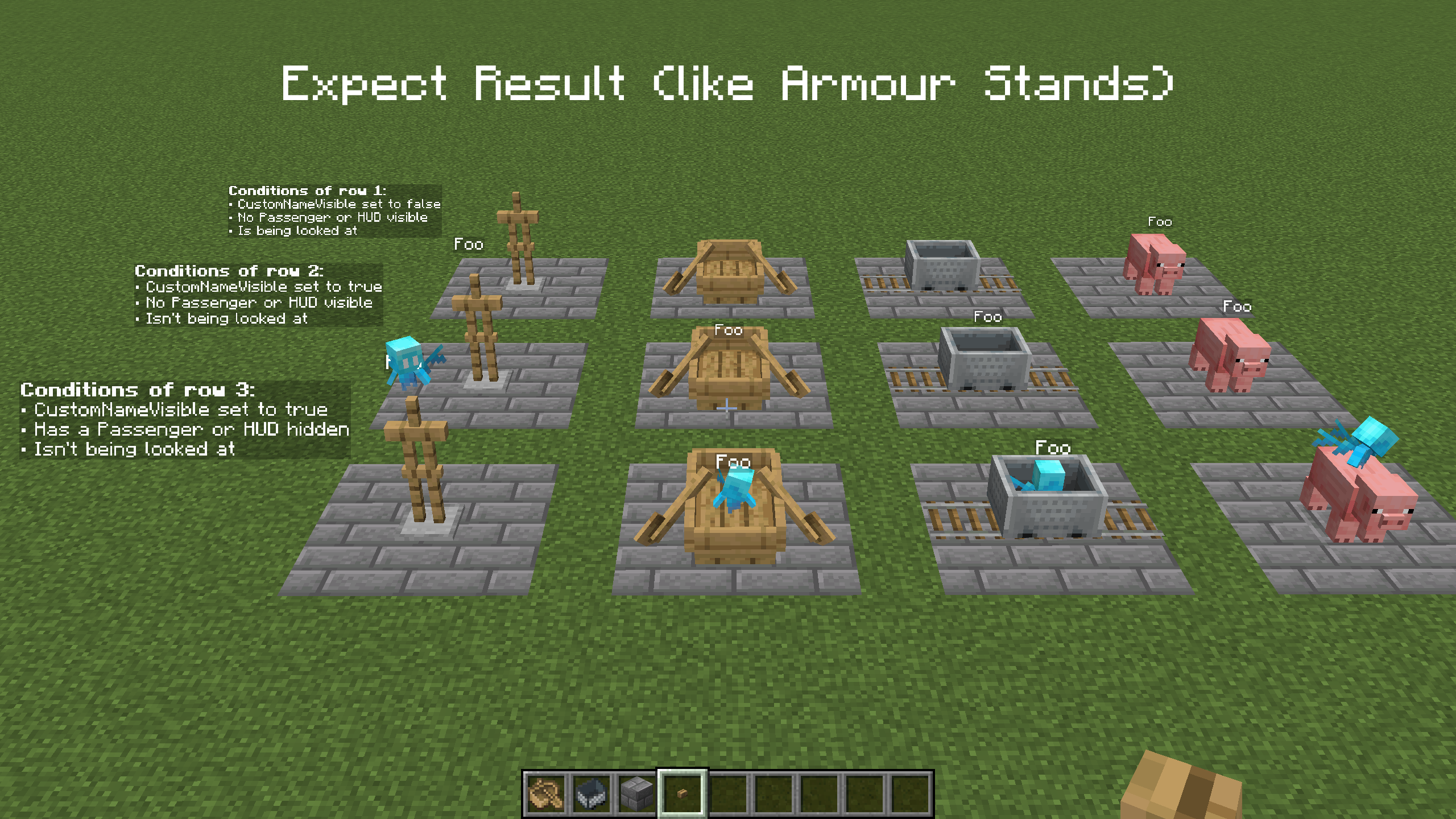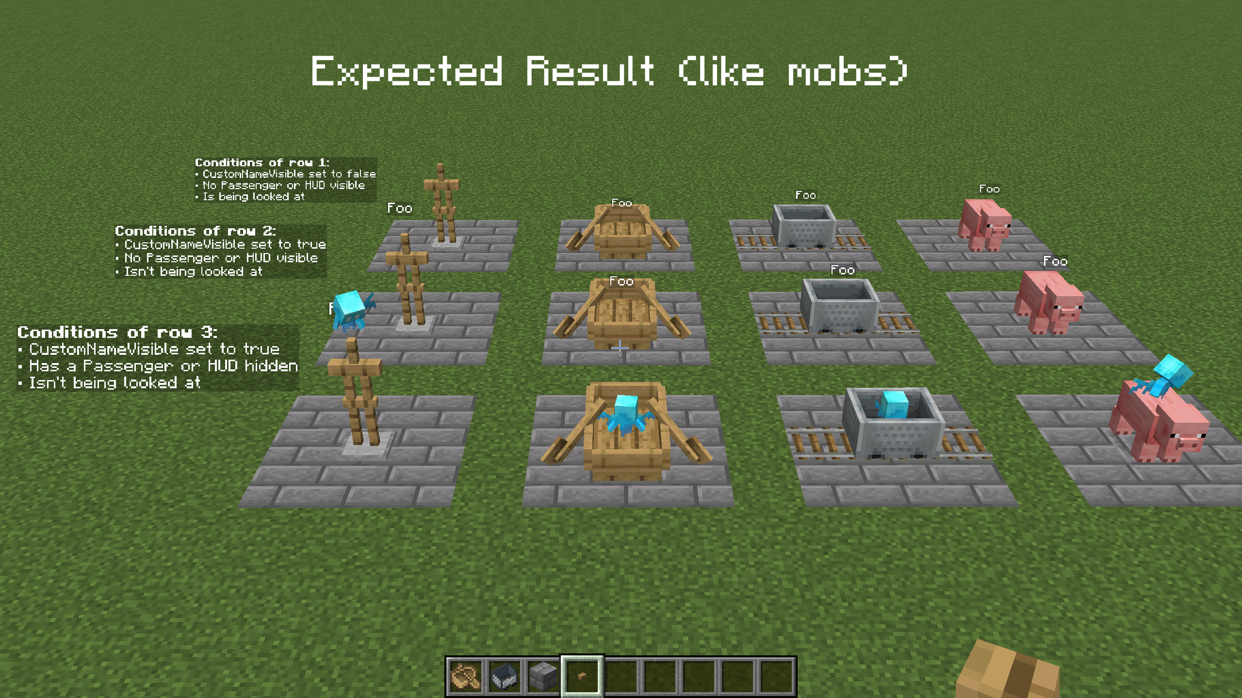 The nametag/nameplate visibility of Boats and Minecarts is quite weird compared to other entities, preventing them to be spawned with an invisible nametag. As seen below, the conditions that affect the visibility of their nametag are a weird mix between Armor Stand’s (which have unique conditions due to their technical uses) and other mob’s.