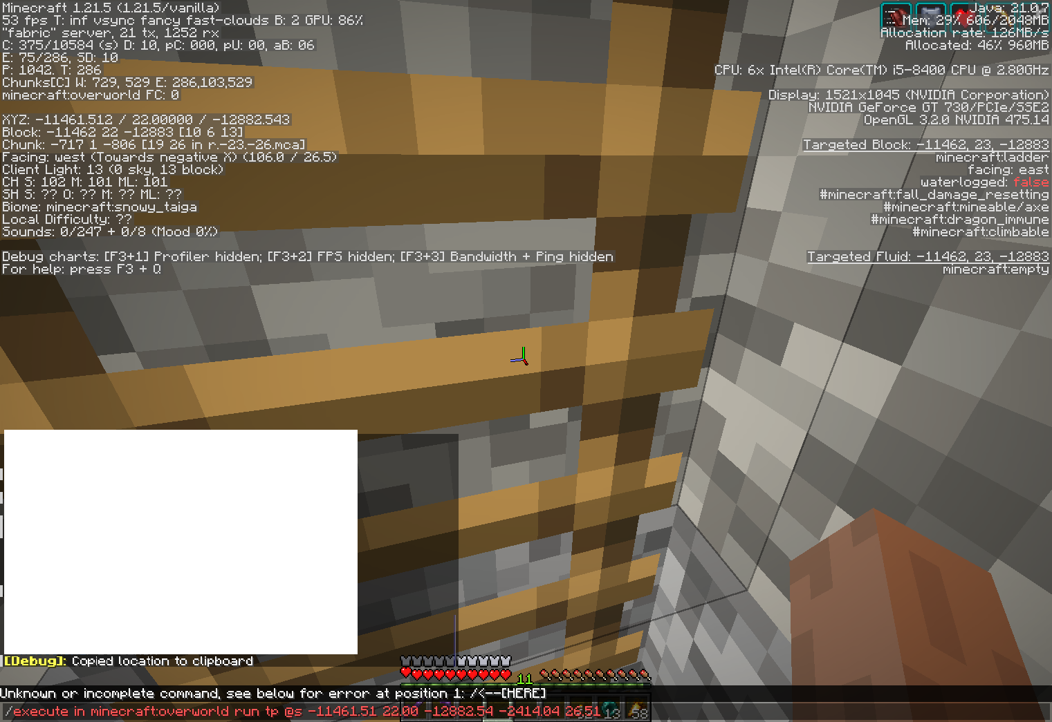 /execute in minecraft:overworld run tp @s -11425.73 25.06 -12900.30 -2415.56 -1.74Correct Coordinates