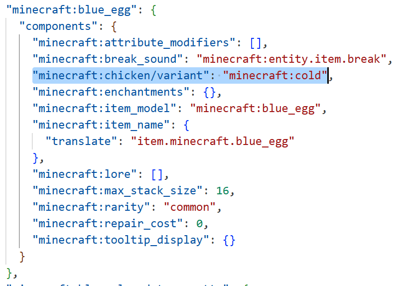By data generator, we can get items.json. It tells us the blue egg has default component chicken/variant with default value “minecraft:cold”. But command execute don’t think blue egg has this default value.