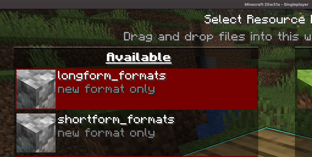 I have attached two packs which both load correctly in 1.21.8, however in 25w31a the pack using the object format (longform_formats) appears as “broken or invalid” despite having the correct format versions specified. I’ve also attached both packs below alongside screenshots