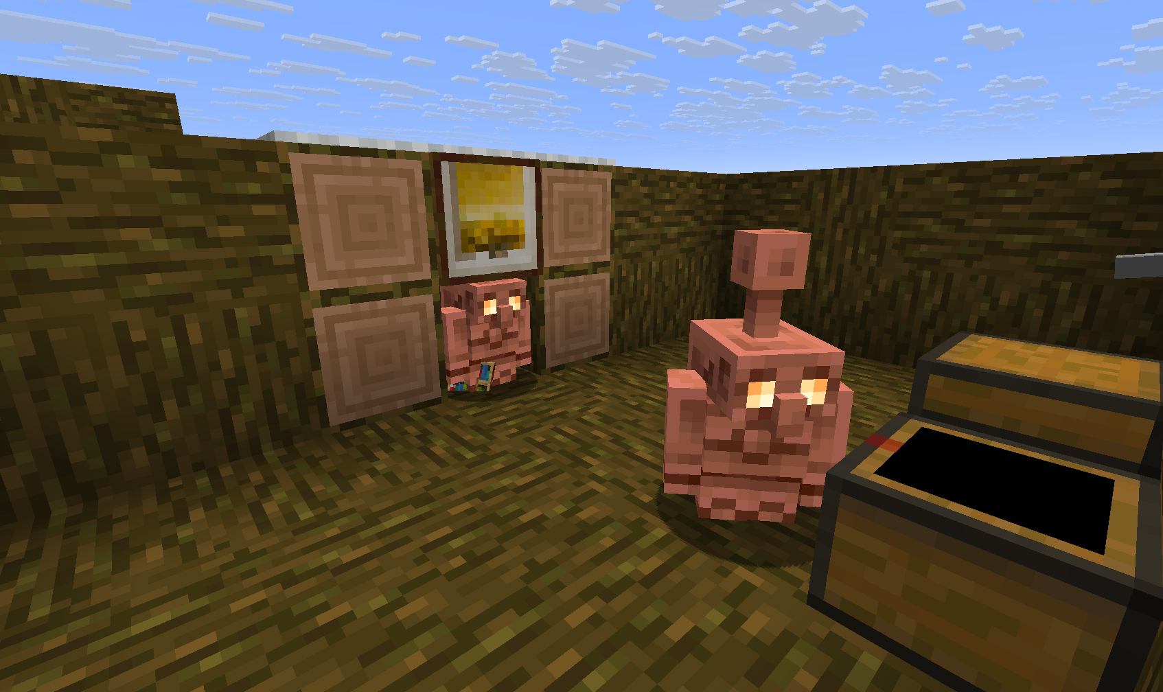 The Copper Golem, despite easily fitting in one block-tall environment, cannot pathfind in it. Infact they can’t even path find through open doors and they can even get stuck under a 3 by 3 platform. If I want my iron golem to path find outside to collect items from a farm, I can’t just make a tunnel or open some doors and call it a day, I literally have to put a 2 by 1 hole in my house, which, as you know, lets in a lot more in than a Copper Golem.