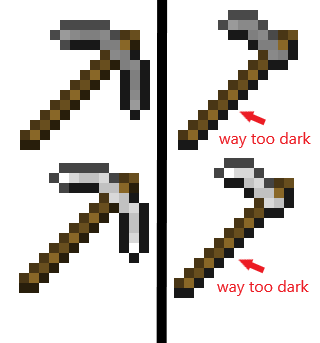 The hoe textures have a miscolored shadow on the right side. This surprisingly only applies to stone hoes and iron ones. I attached an image to show the miscolored pixels. On the left of the image you can also see the way the sticks are supposed to look (like they do on the pickaxes). With the right edge of the stick having a more brown (wooden) color, instead of that the hoes have the shadow color of the actual iron/stone part. This does not apply to diamond, netherite, gold, wooden or copper hoes. The issue only exists for stone and iron hoes.