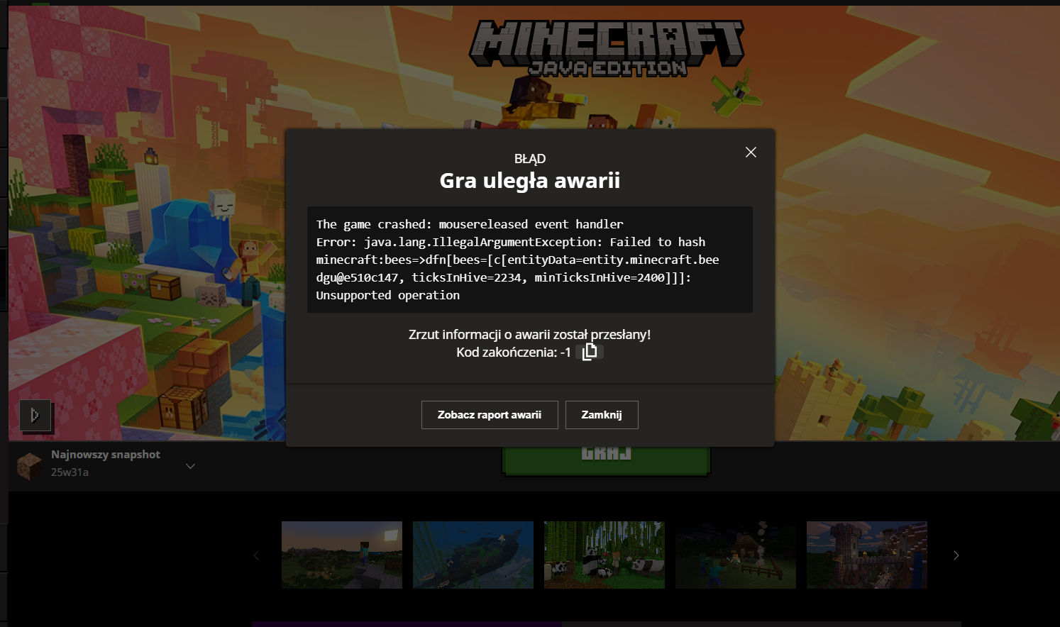 Game crashes when I’m trying to click on a bee hive or bee nest with bees inside in an inventory or move it in an inventory. I have Minecraft Launcher in Polish, sorry for inconvenience.
