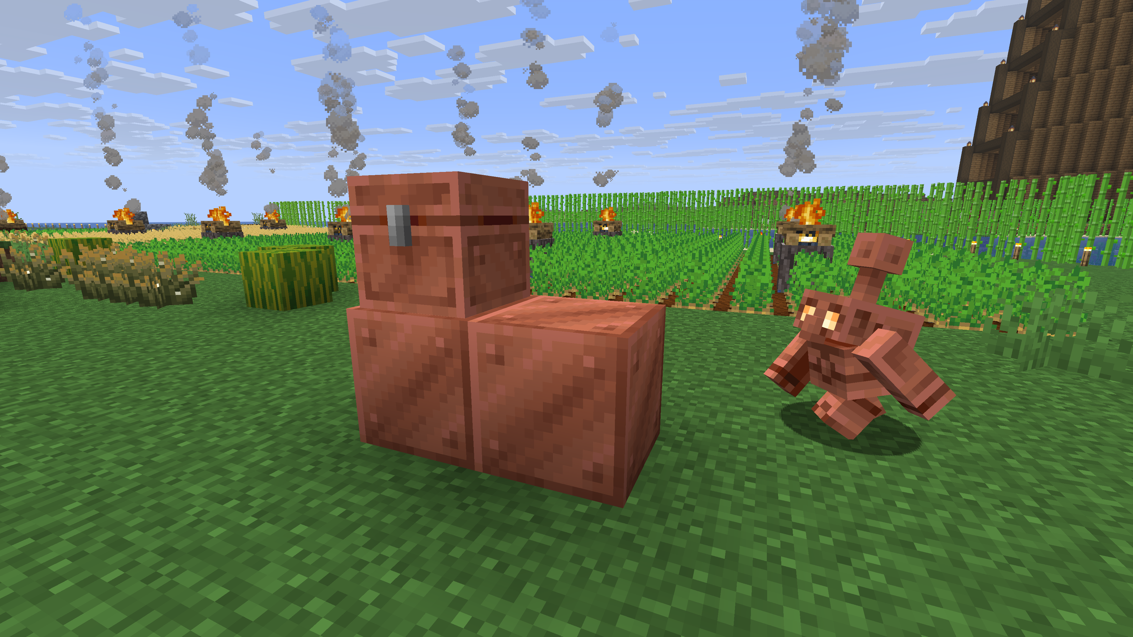I place three copper blocks in L-shape, i.e. blocks A and B adjacent horizontally, block C right above block A. Then, I place a carved pumpkin right above block B. Afterwards, block C (instead of block B) becomes a copper chest.