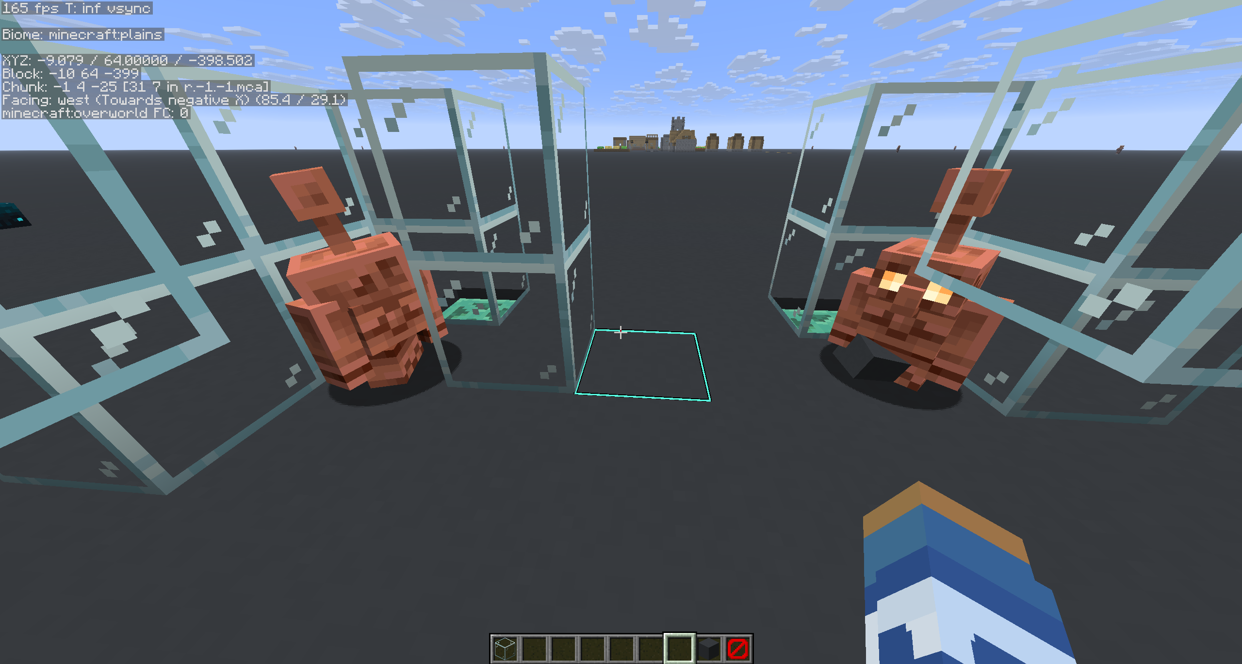 If the golem is in a 1x1 hole it will check chest down and to the side of it. But if it’s in a 2x1 hole it will never walk to the center of either block so it’s never close enough to reach that same chest.