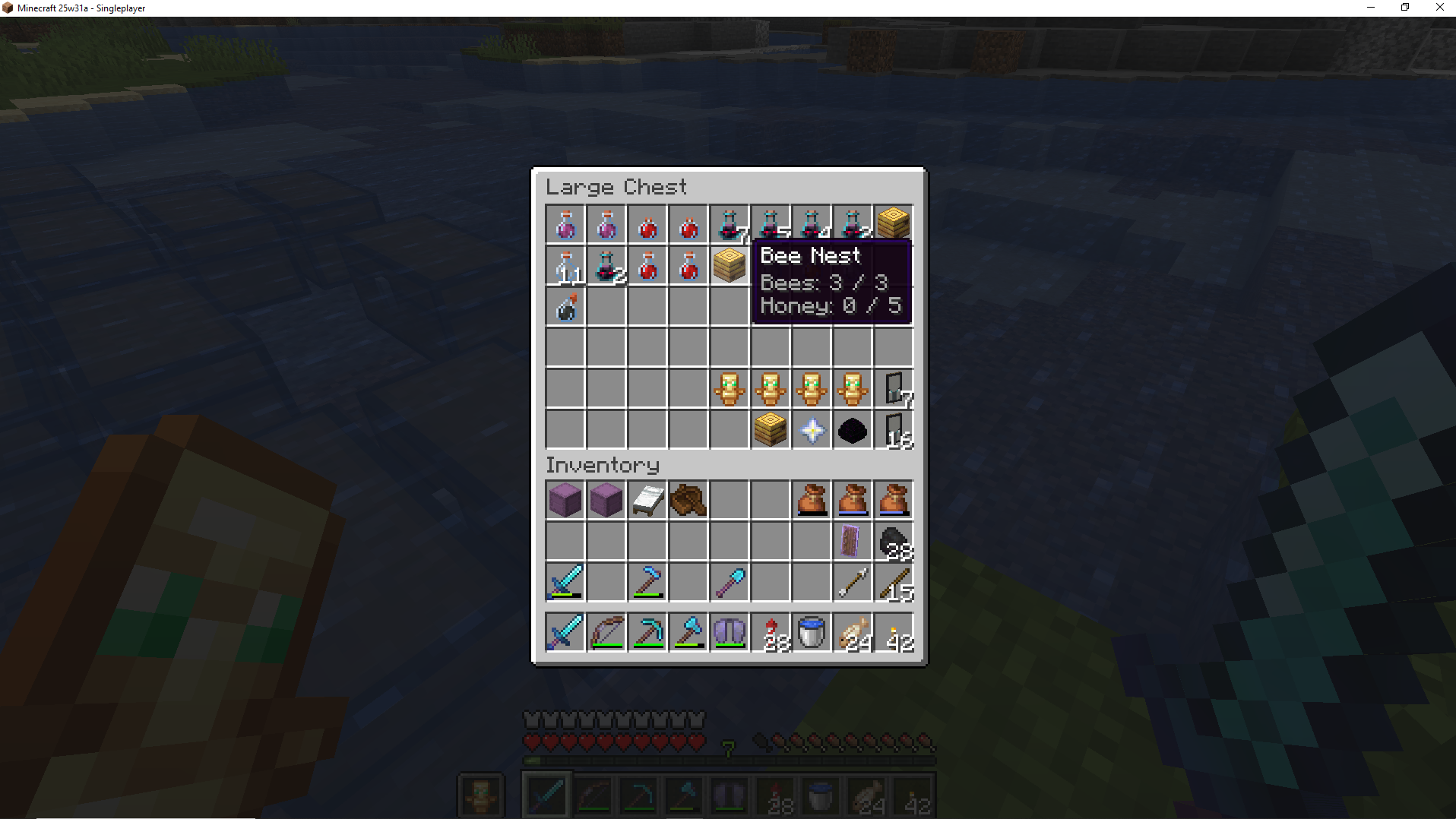Steps to reproduce the issue: Attempted to place Bee’s Nest from inventory into double chest. Bee’s Nest contained 3 bees.