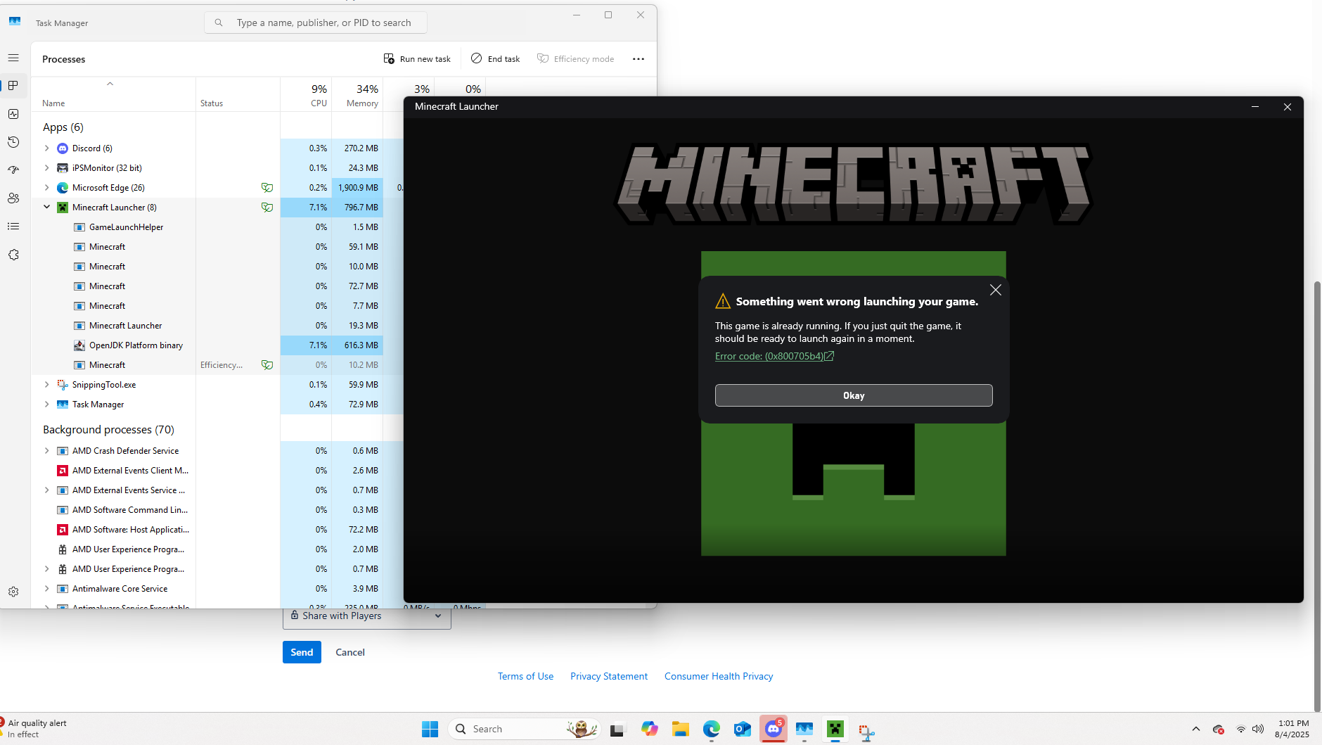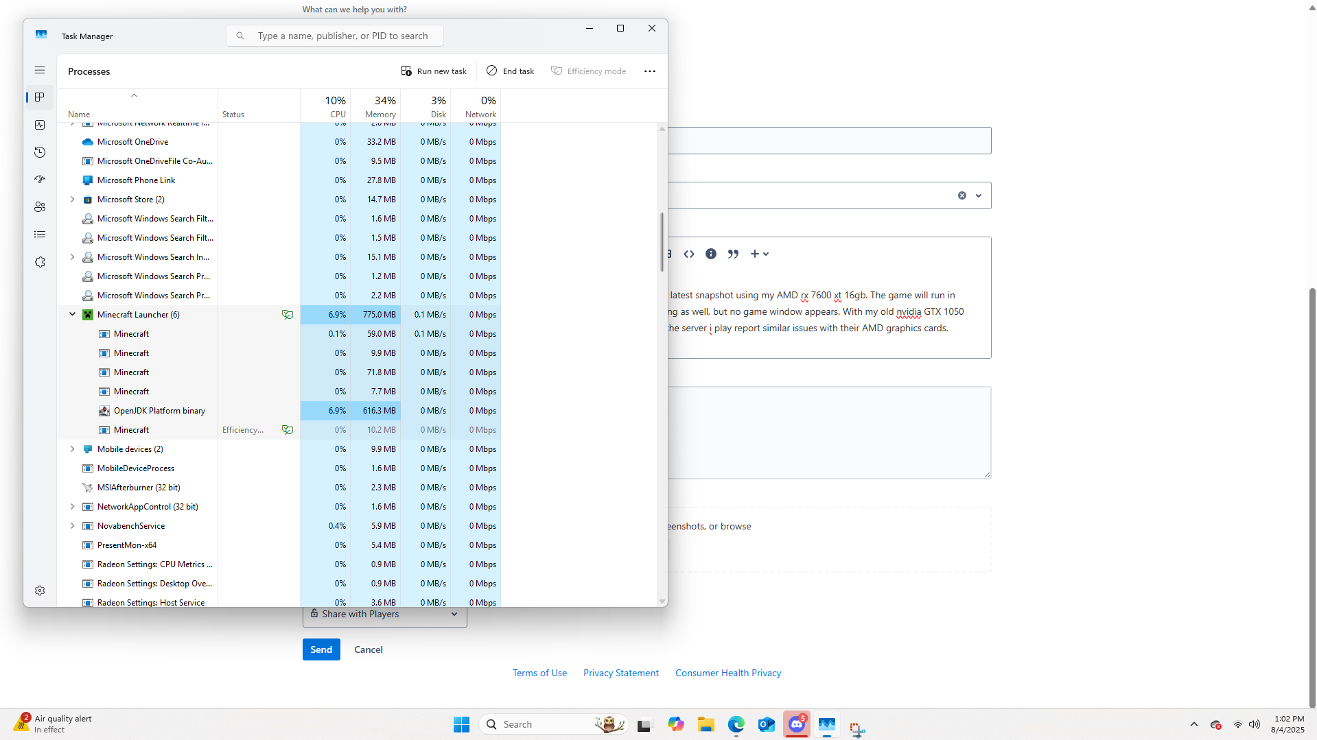 Hello, I have been unable to launch the latest version of Minecraft (1.21.8) and the latest snapshot using my AMD rx 7600 xt 16gb. The game will run in the background according to task manager and Minecraft launcher says it is running as well, but no game window appears. With my old nvidia GTX 1050 pc the game WILL open. The AMD card CAN play 1.21.0 and 1.20. Other users on the server i play report similar issues with their AMD graphics cards. I reinstalled the game 3 times with the same result each time. AMD driver version: 32.0.21013.1000, date 5/26/2025. Reproduce the issue: Use an amd rx 7600 xt 16gb or other graphics cards the community cannot launch the game on. Specifications of the AMD pc: 7600 xt 16gb, 32gb ddr5, r7 9800x3d, b650 mobo, 2tb m.2 pcie gen 4. Nvidia pc that COULD run the game: gtx 1050 2GB, r5 4500, 16gb ddr4, 256gb/1tb sata SSDS (2), b450