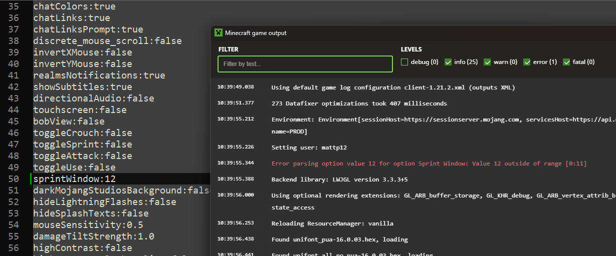 In 25w32a, a sprintWindow option was added to options.txt. When setting this to something outside of the [0:11] range, it says the value is out of range.