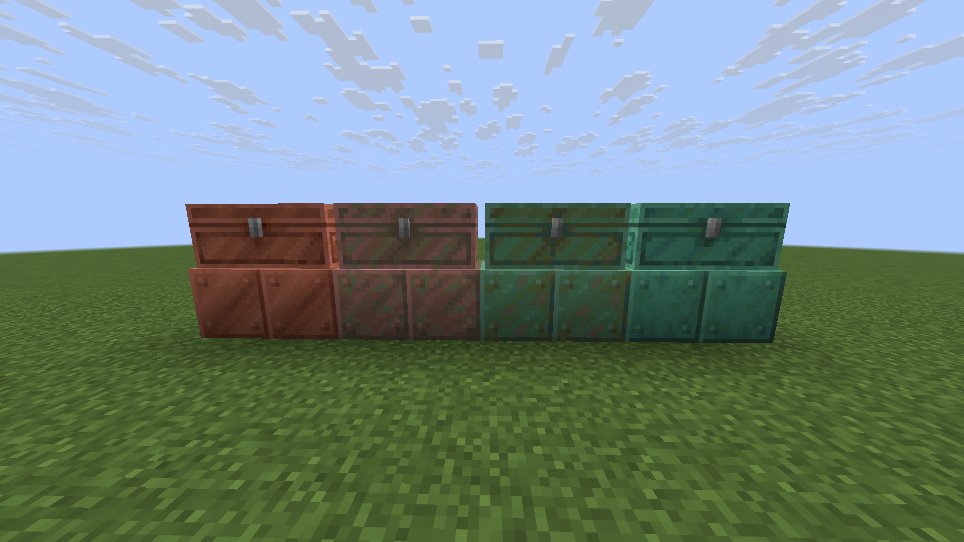 Oxidized Copper chests have a diagonal “reflection” (the diagonal stripes of color) in their texture. Normally, many unoxidized copper blocks have this reflection stripe in their texture, however, as the copper oxidizes, this stripe goes away. On copper chests, this stripe does not go away even when the chest is fully oxidized, causing an inconsistency.