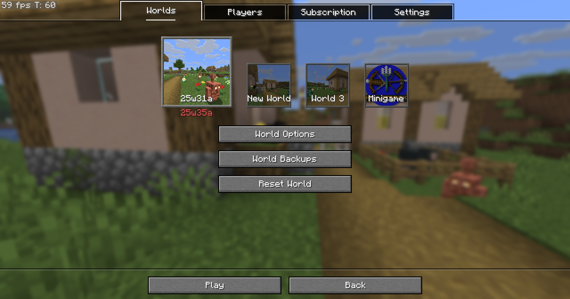 Worlds → World Slot 1 → World Slot 2 → Minigame → World Options → World Backups → Reset World → Play → Back