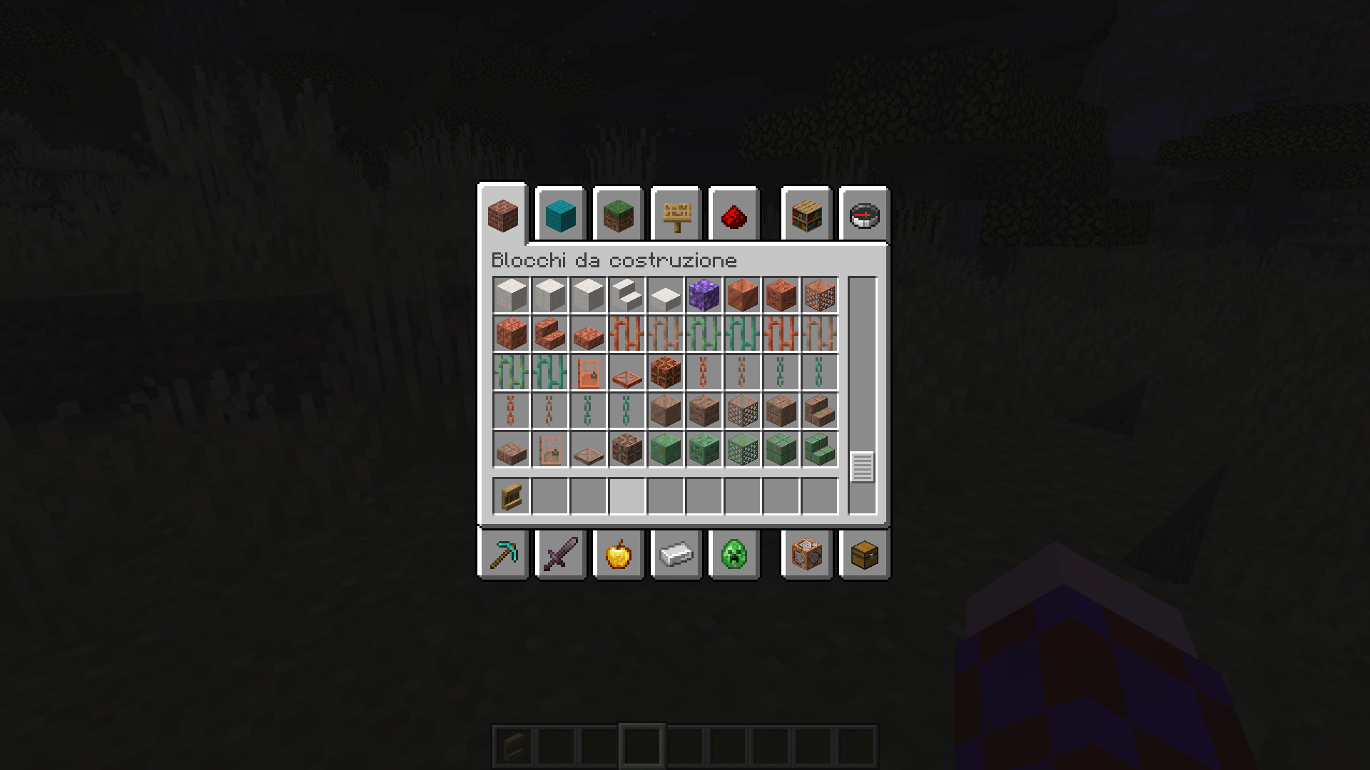 The normal copper door, copper trapdoor and copper bulb are misplaced in the creative inventory in the building blocks tab, being placed far away from where they should be due to the presence of copper bars and chains.