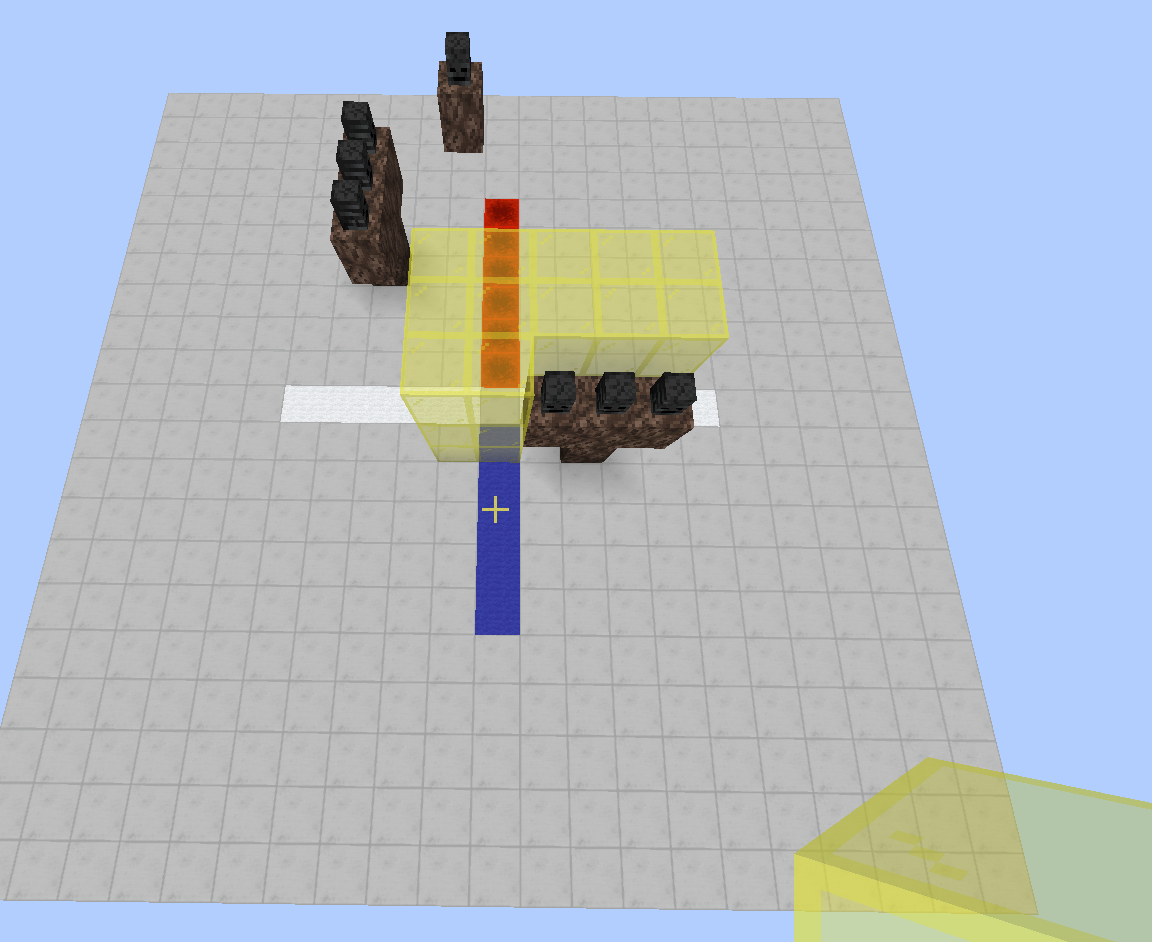 This is heavily directional. If your wither is built ‘facing’ east/west instead (like in the top left corner of the first image), you cannot spawn it via placing skulls anywhere around it. Only when it is facing North/South does it have this ability, and always in the area defined in yellow in all relevant images.