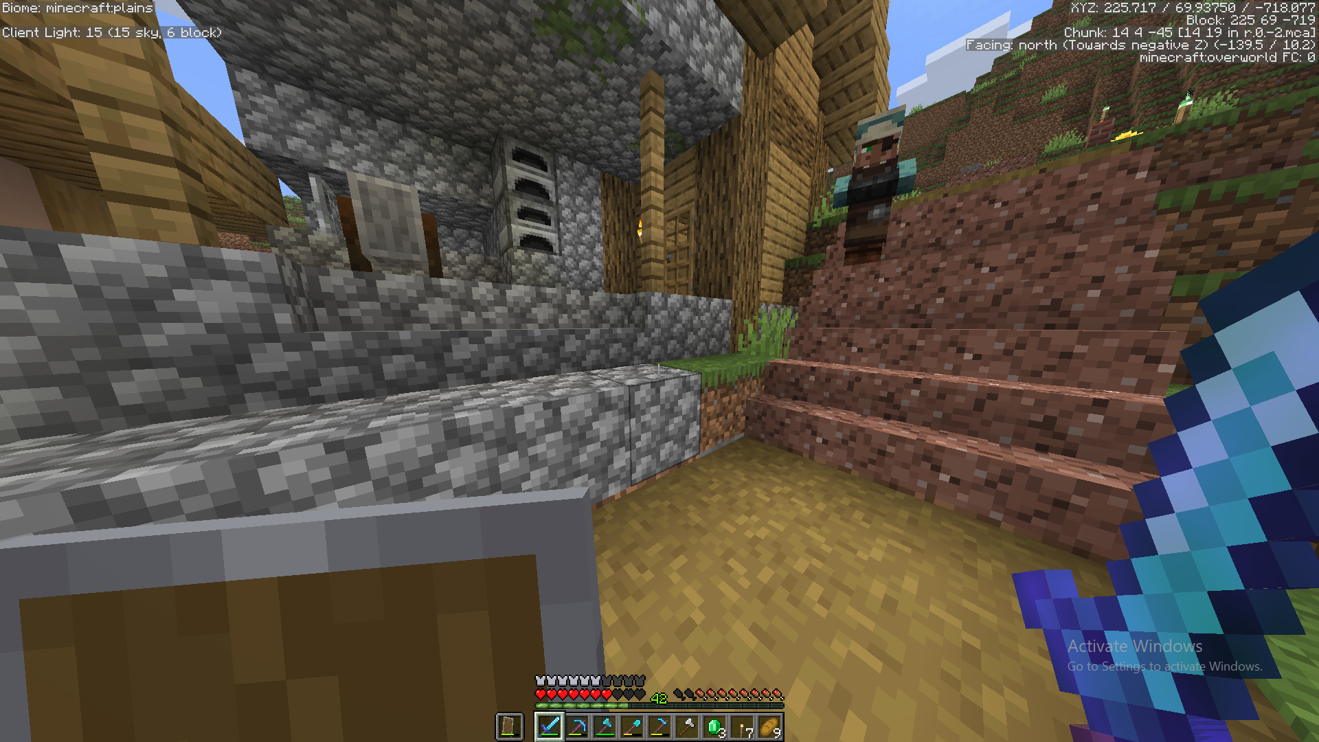 In the screenshots I provide the Villager in question, a small bird’s eye view of the section of the village where the Villager is working, the Blacksmith building in question, and the interior of the said Blacksmith building I closed the Zombie Villager in for curing.