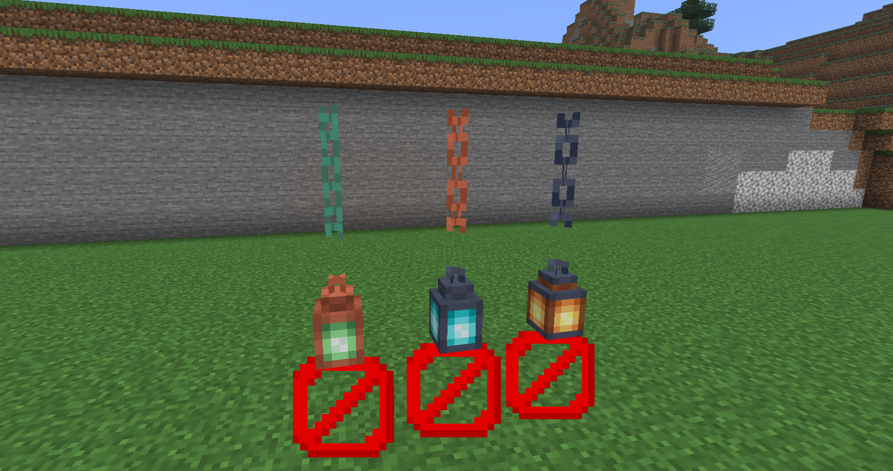 In normal circumstances (for example, when the lantern is placed on a solid block), the lantern visually attaches to the chain above it, creating a hanging effect.