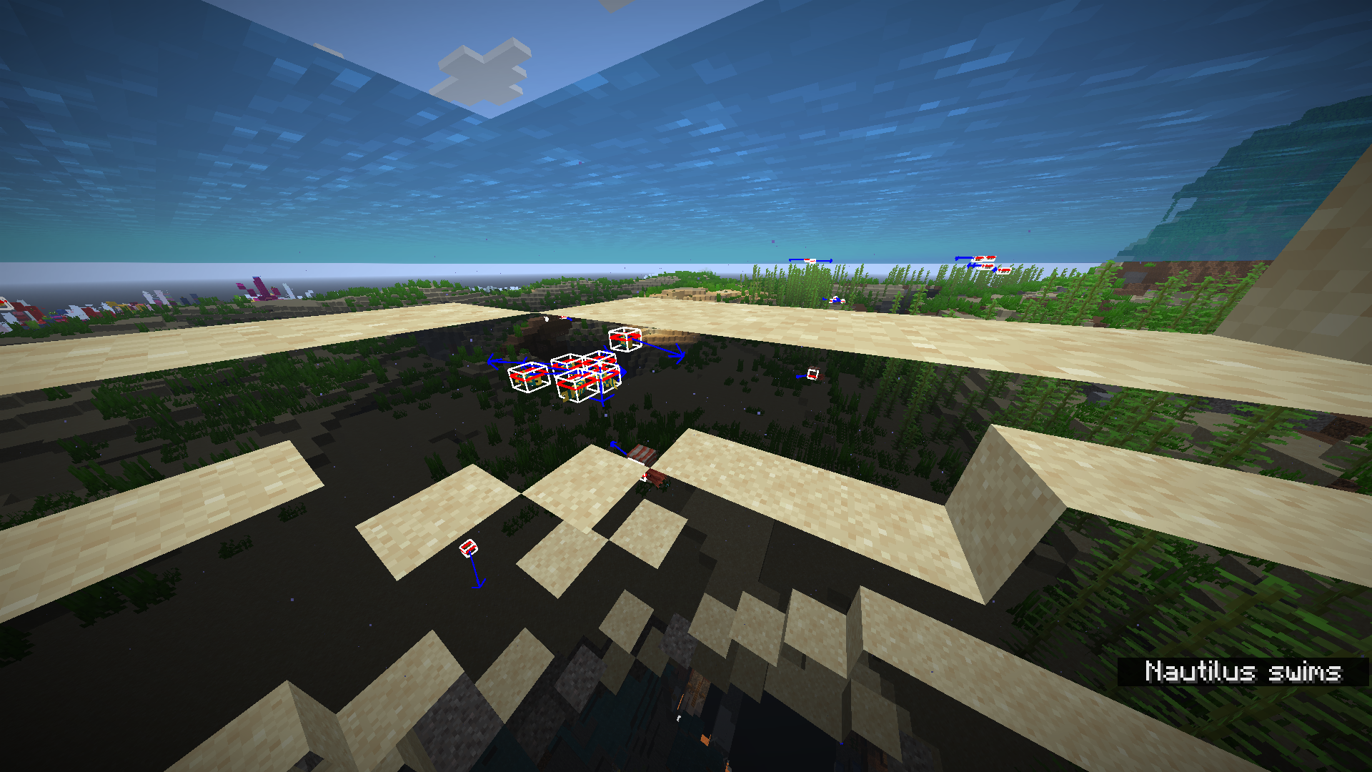 Hitboxes of submerged entities don't render when the player is looking at them from a surface. However, if you are in spectator and use it to phase through solid ground, the hitboxes will reappear