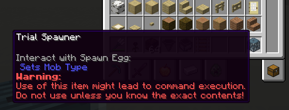 Additionally, a warning will be added to item tooltip if placing such item might directly or indirectly lead to command execution with high permission level