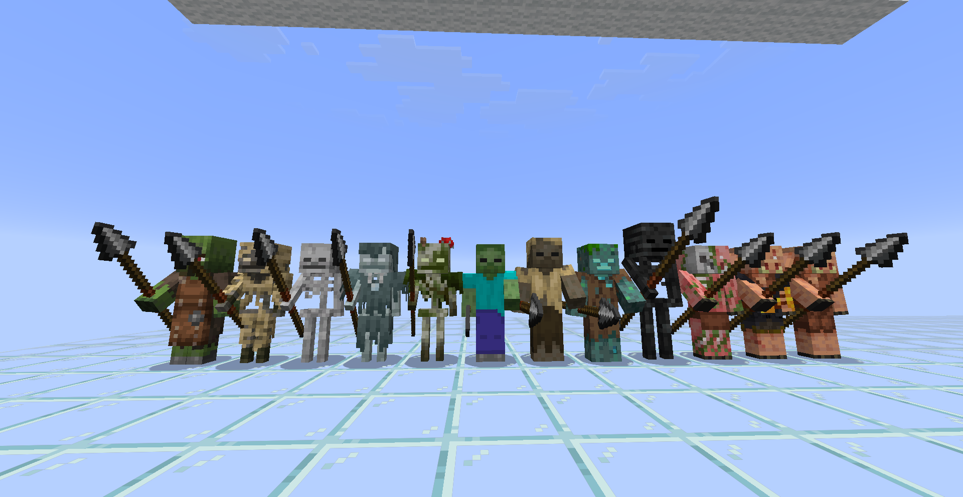 Zombies, husks, and drowned hold out their offhand arm instead of their mainhand arm when holding a spear, which looks a bit strange and is different from all other mobs holding spears.