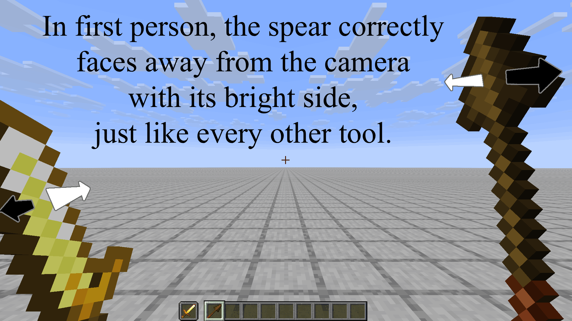 I always wondered about this. That all tools have their bright side facing down, and their dark sides facing up, contradicting the direction of sunlight. Could this be unintentional? Maybe it's just to be consistent with the first person perspective, I'm not sure. It's definitely not consistent on the spear.