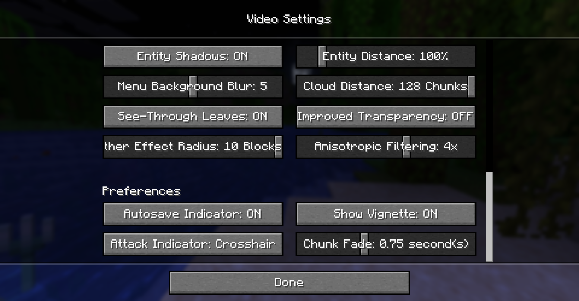 Here are my current video settings, along with a world download. No add-ons or resource packs are being used.