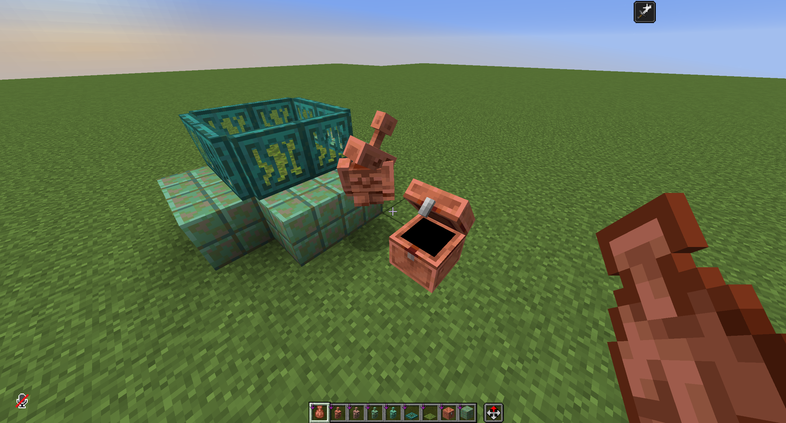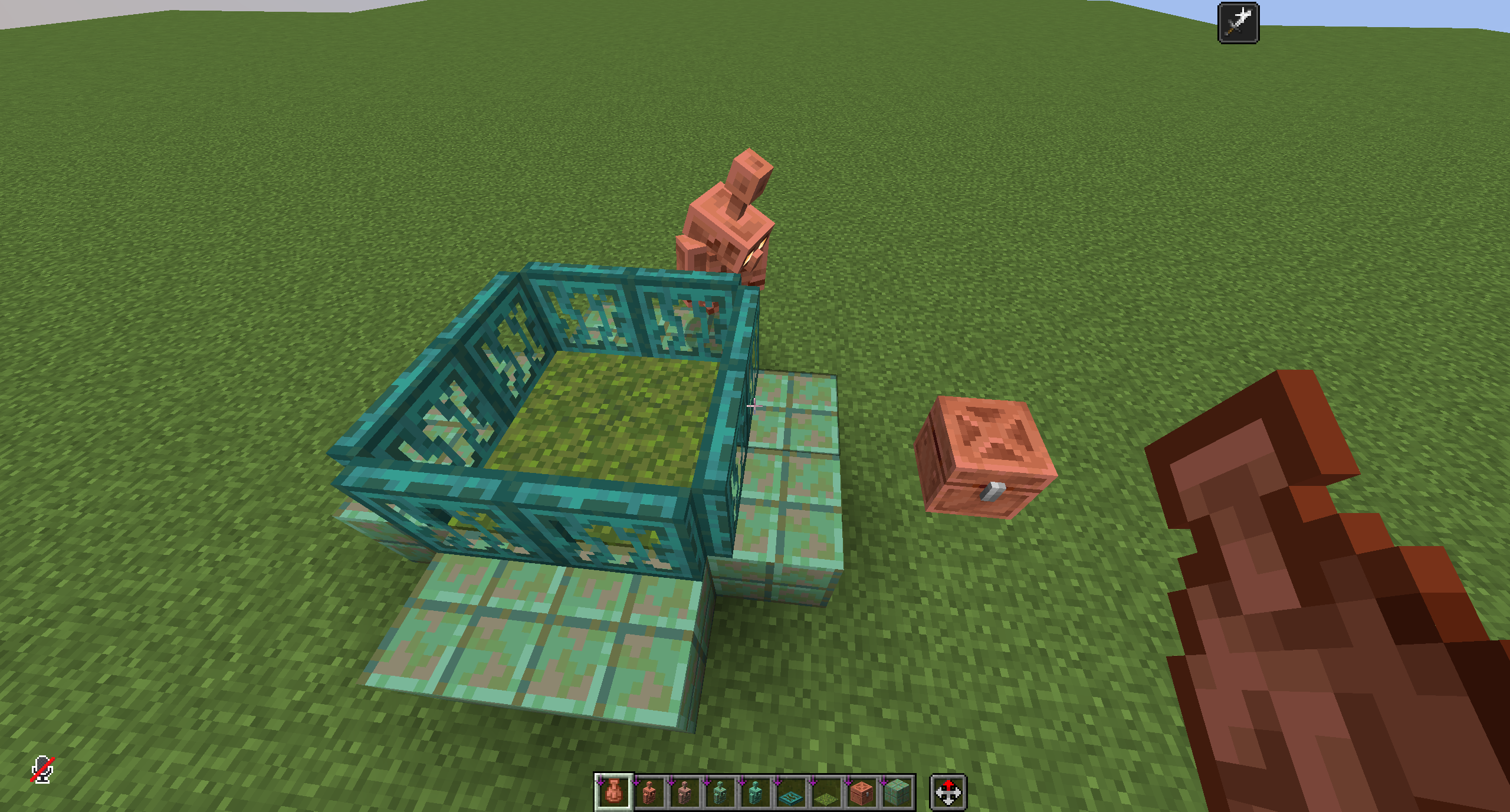 Copper golem will pathfind to a copper chest and is able to get over a full block high trapdoor when honey block has carpet on top and it is standing on it.