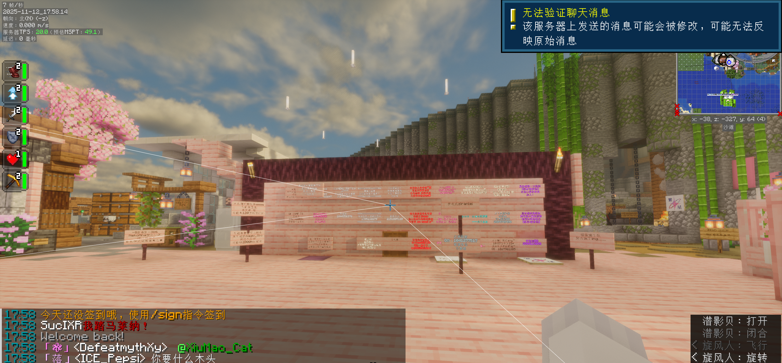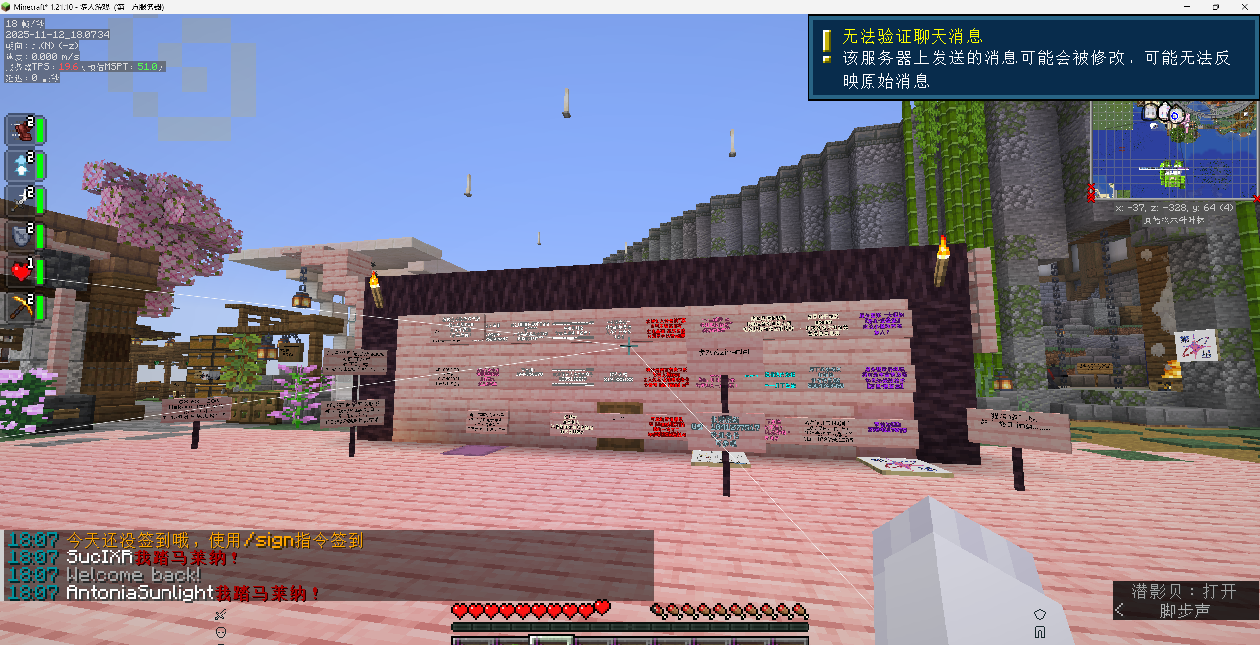 After placing a sign with four lines of text, the frame rate drops noticeably and severely. This issue did not occur in version 1.21.8. Tested and confirmed that this lag is unrelated to any shader mods; it persists even in a completely vanilla (mod-free) game environment.